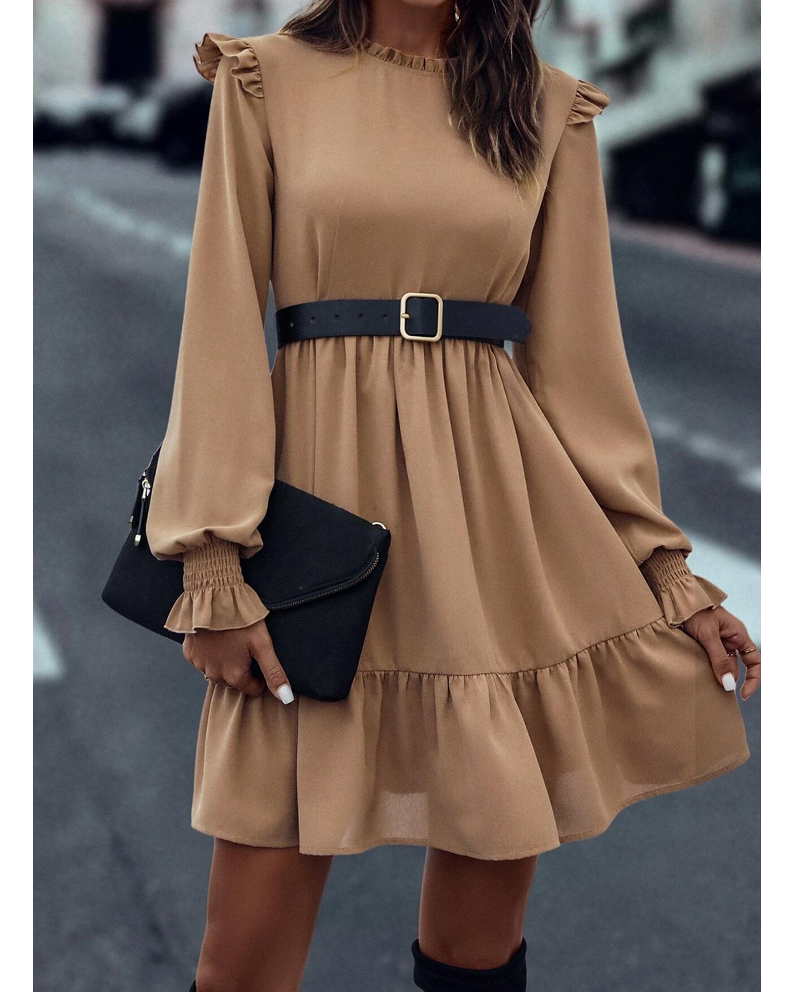 Light French Beige Frilled Collar Ruffled Shoulder Tiered Dress – XL