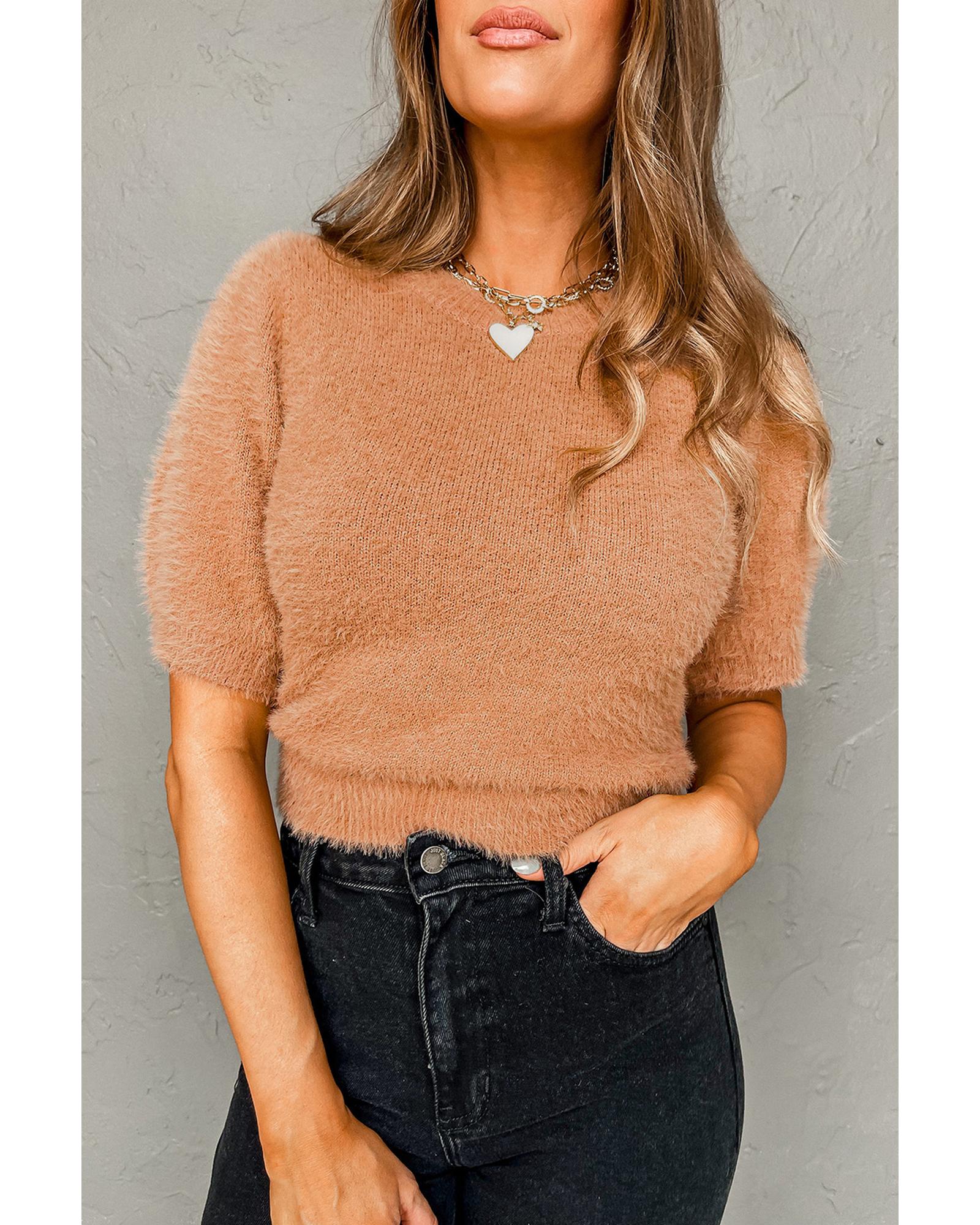 Light French Beige Fuzzy Short Sleeve Sweater – XL