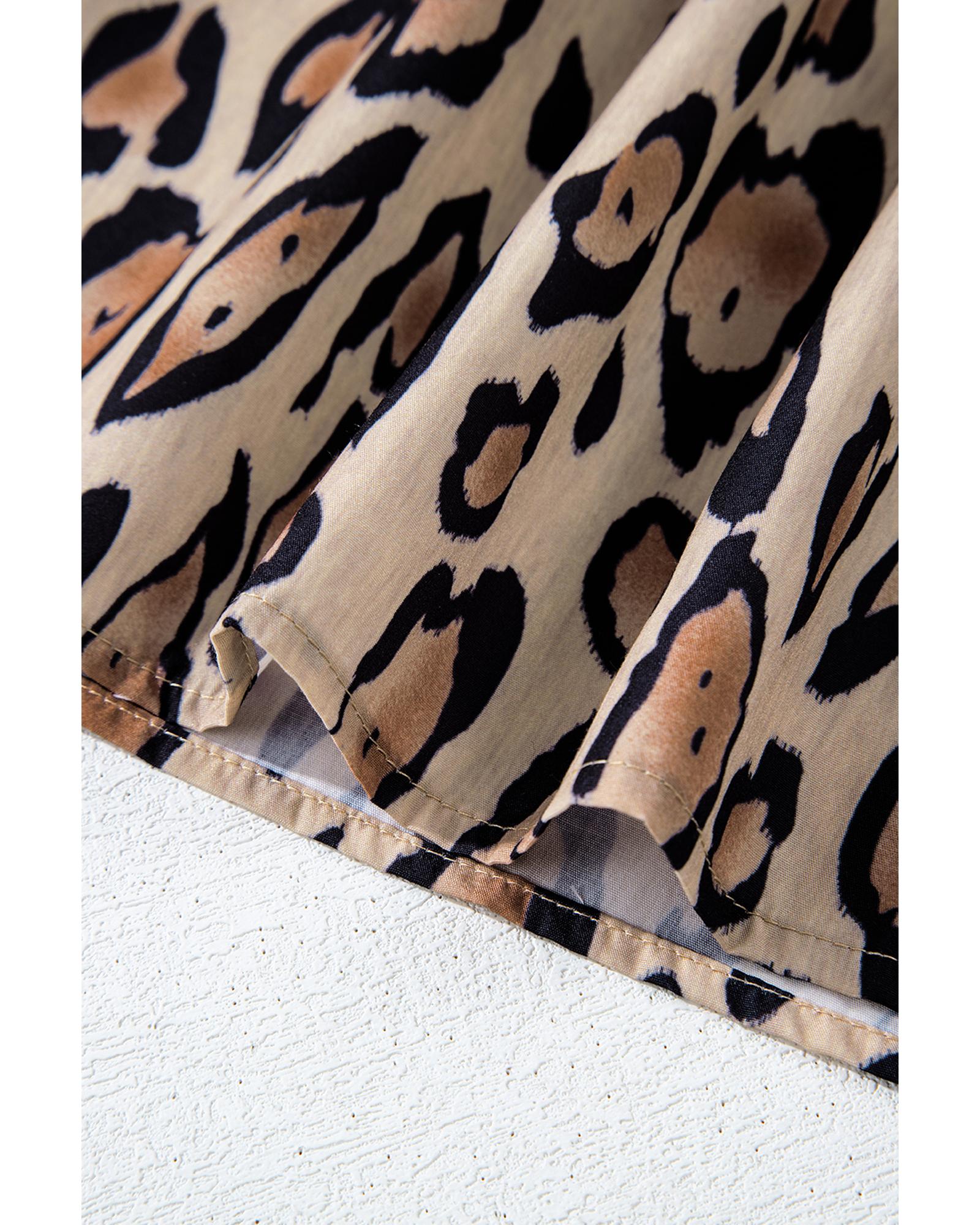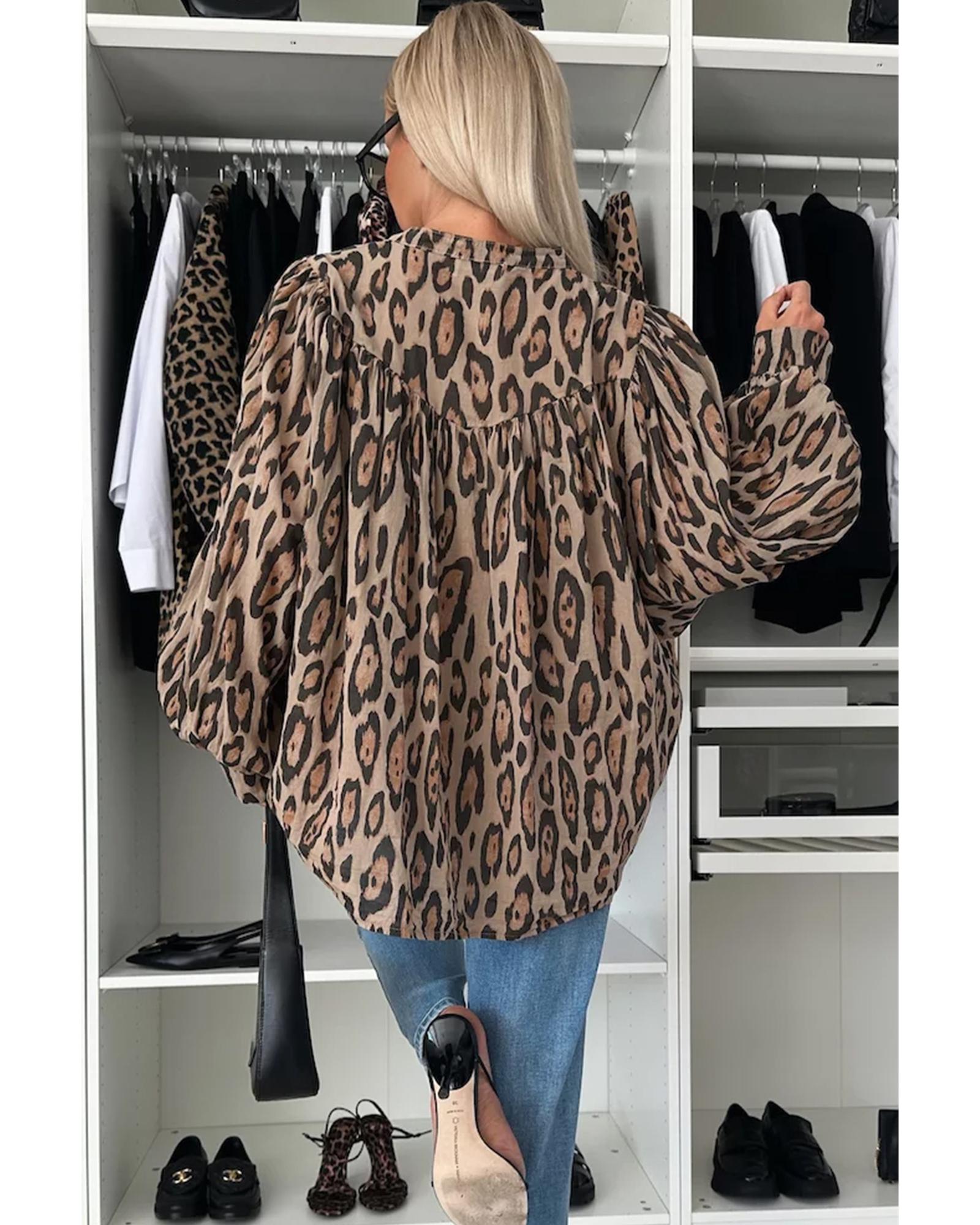 Light French Beige Oversized Leopard Print Balloon Sleeve Casual Shirt – L