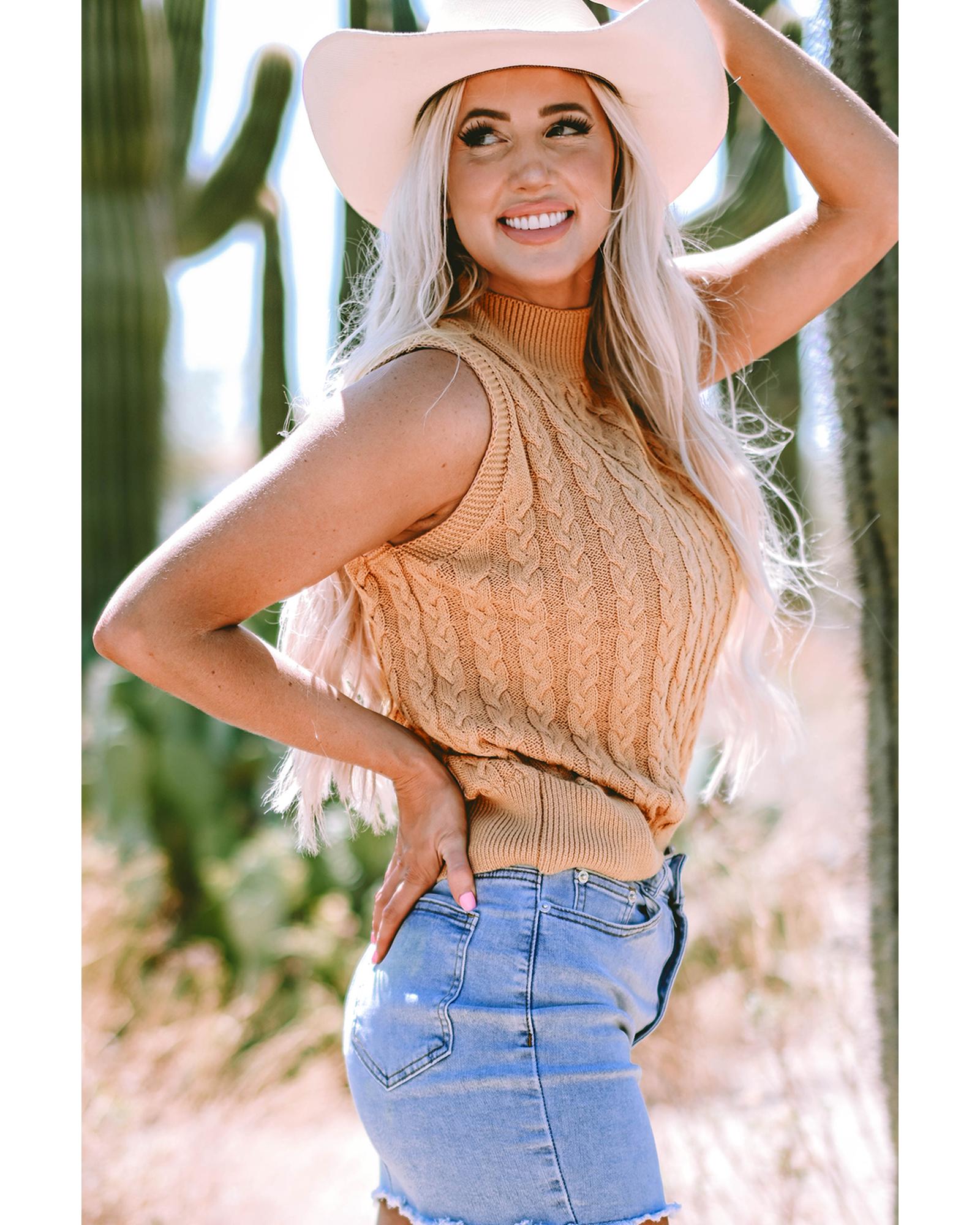 Light French Beige Solid Color Cable Knit High Neck Tank Top – XL