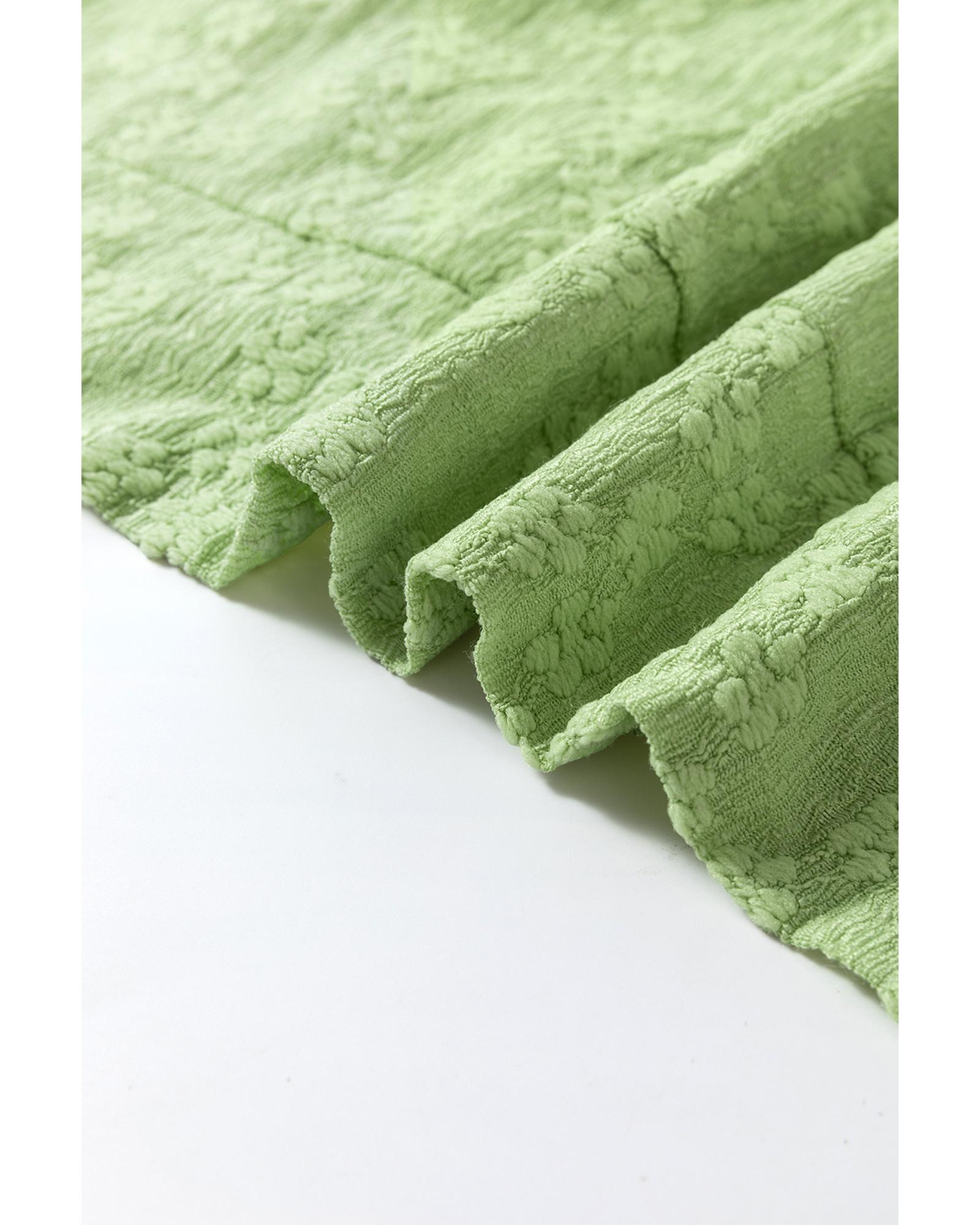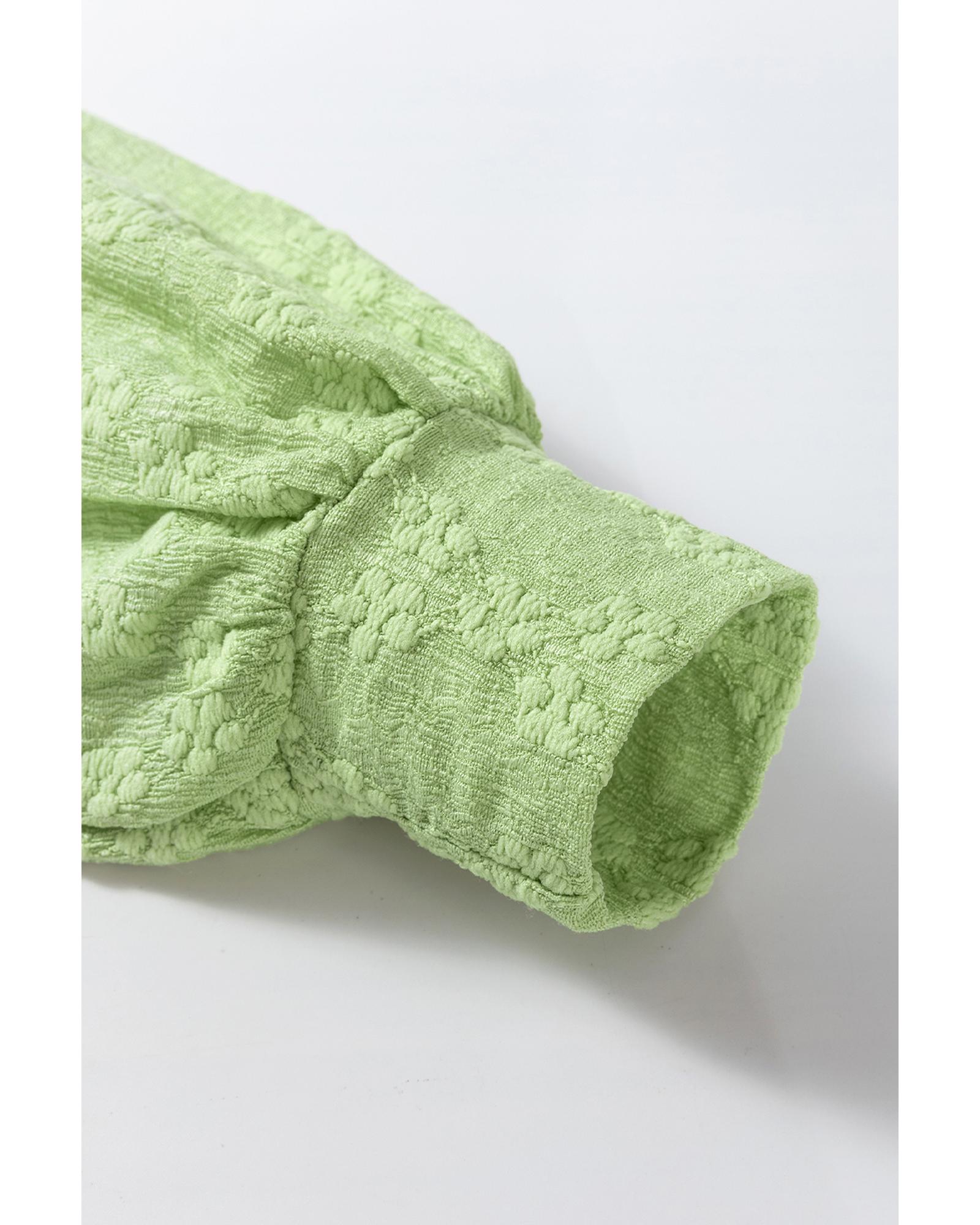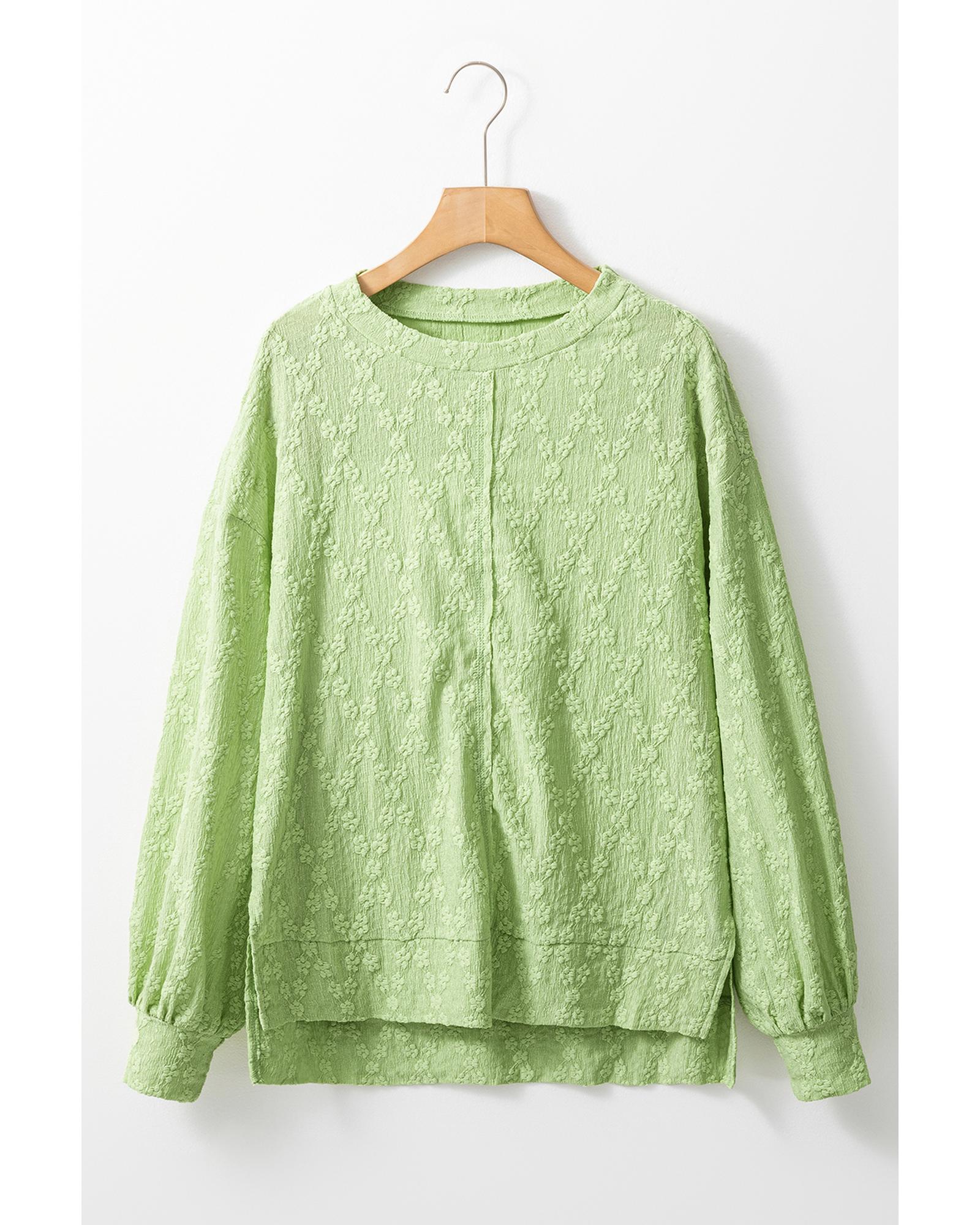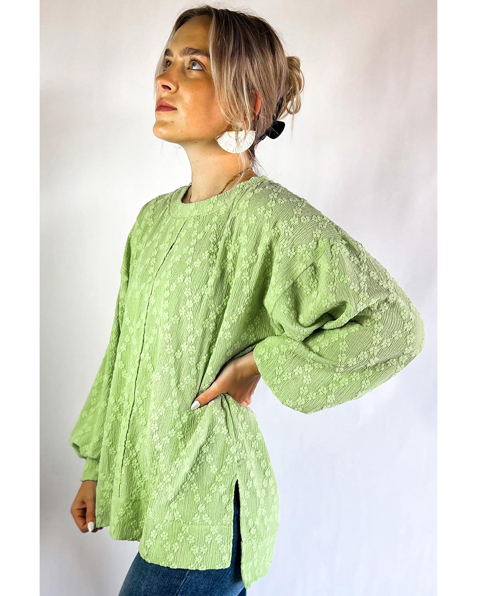 Light Green Solid Color Textured Side Split Crew Neck Blouse – M