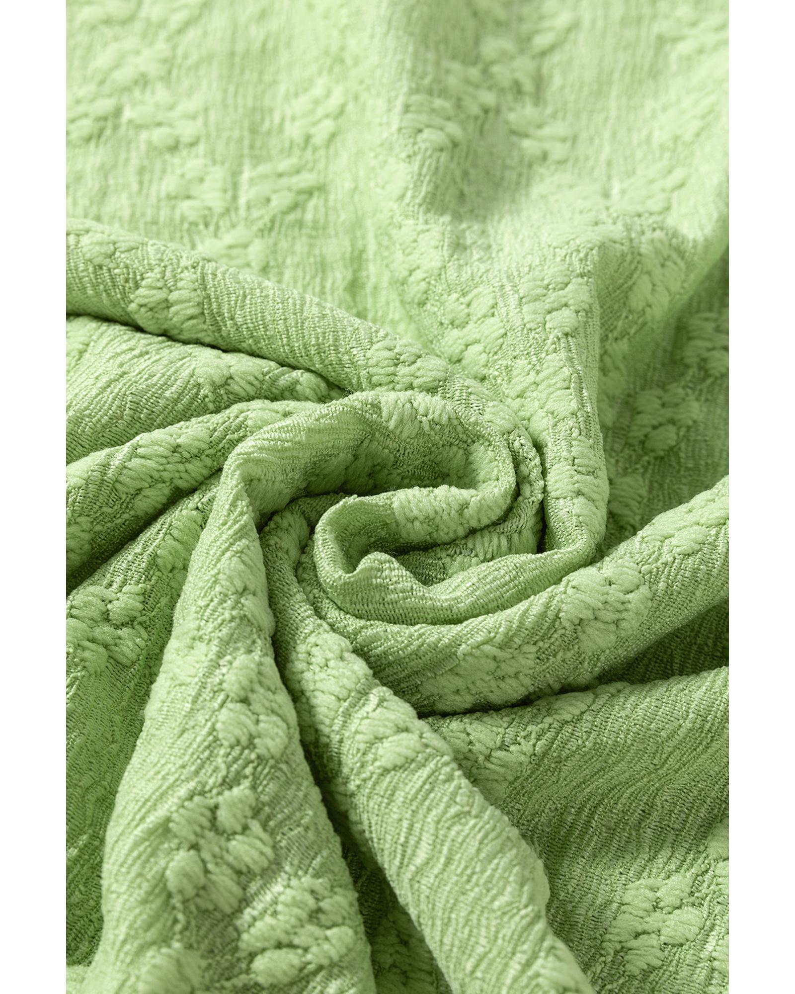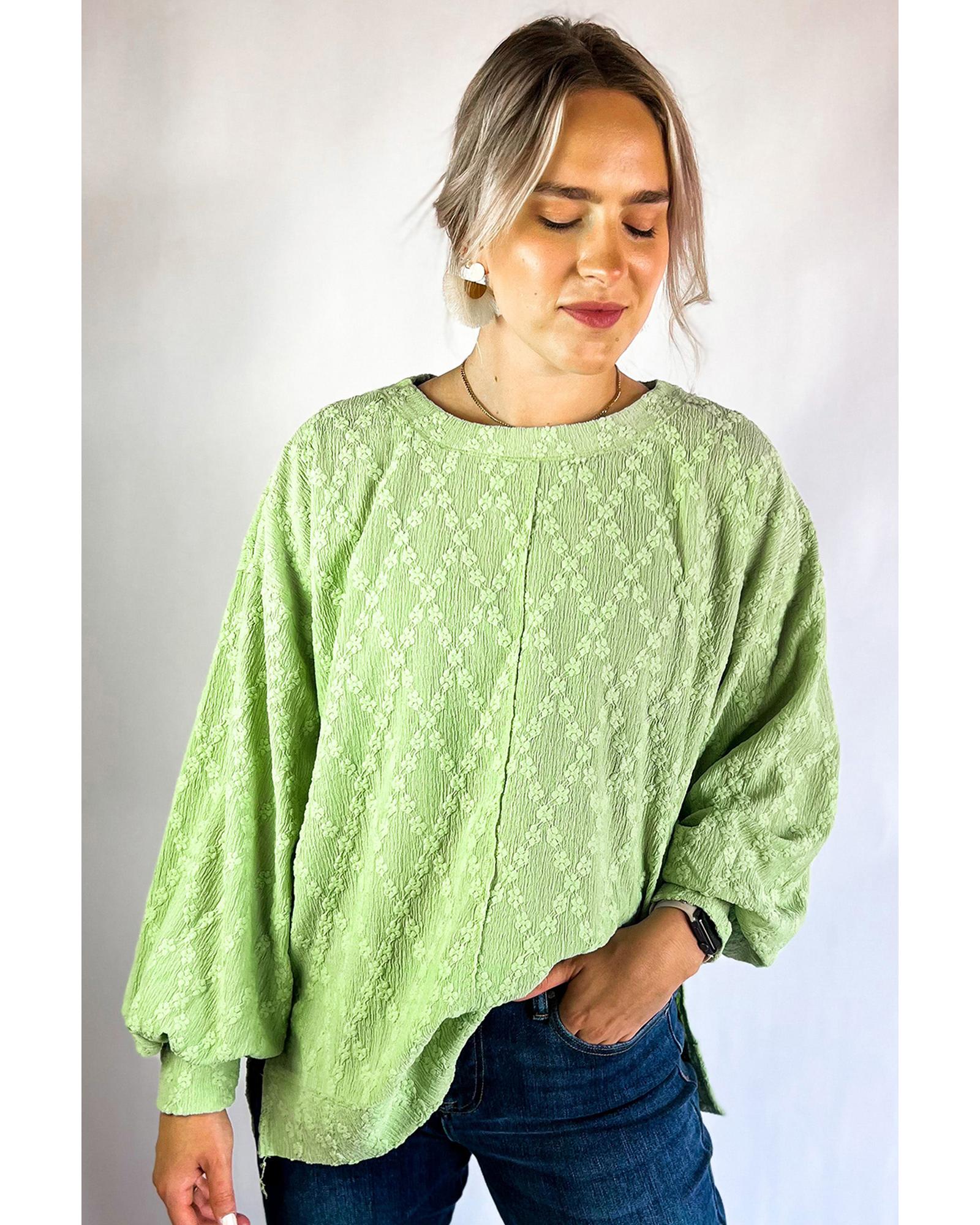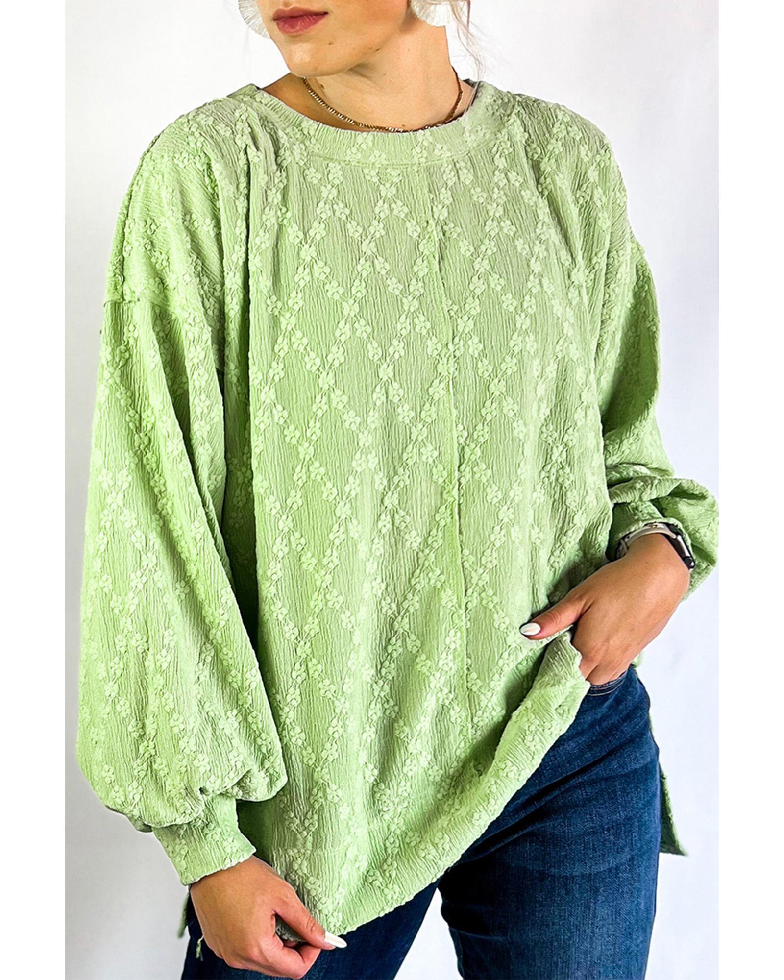 Light Green Solid Color Textured Side Split Crew Neck Blouse – XL