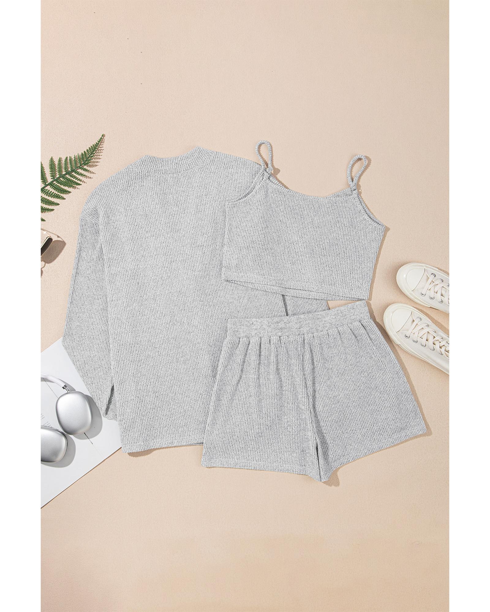 Light Grey 3 Pieces Rib Crop Camisole Matching Shorts Lounge Set with Cardigan – L