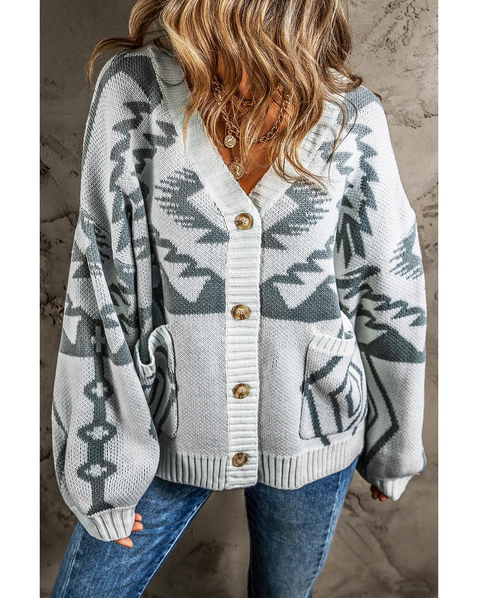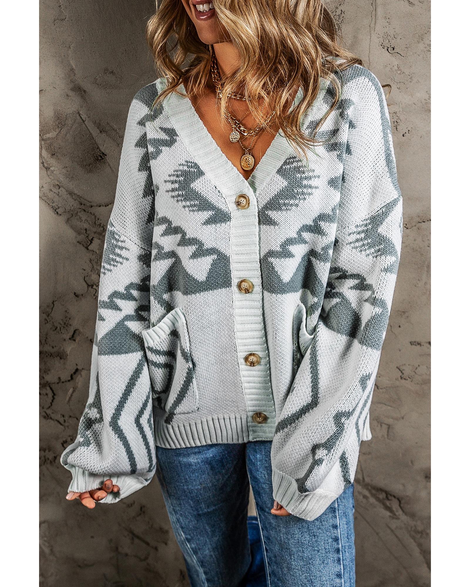 Light Grey Geometric Pattern Ribbed Trim Button-Up Cardigan – XL