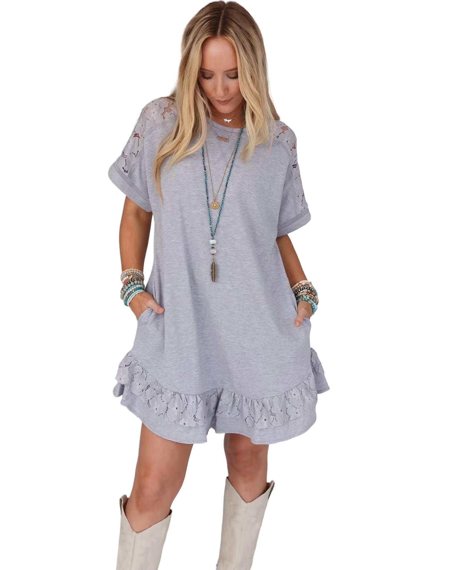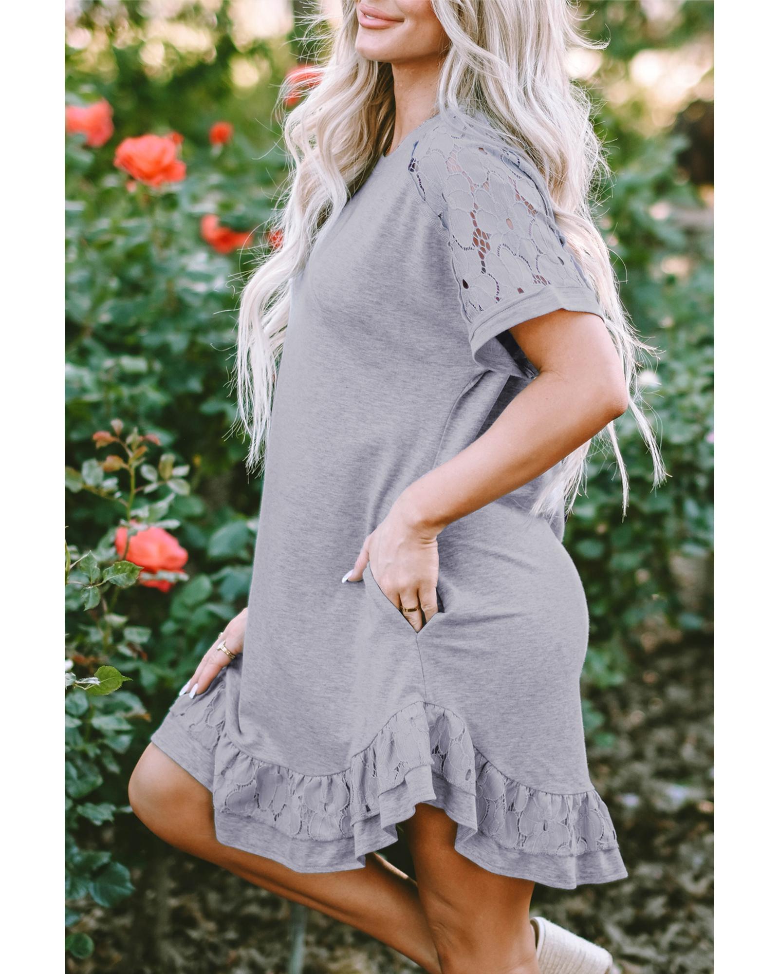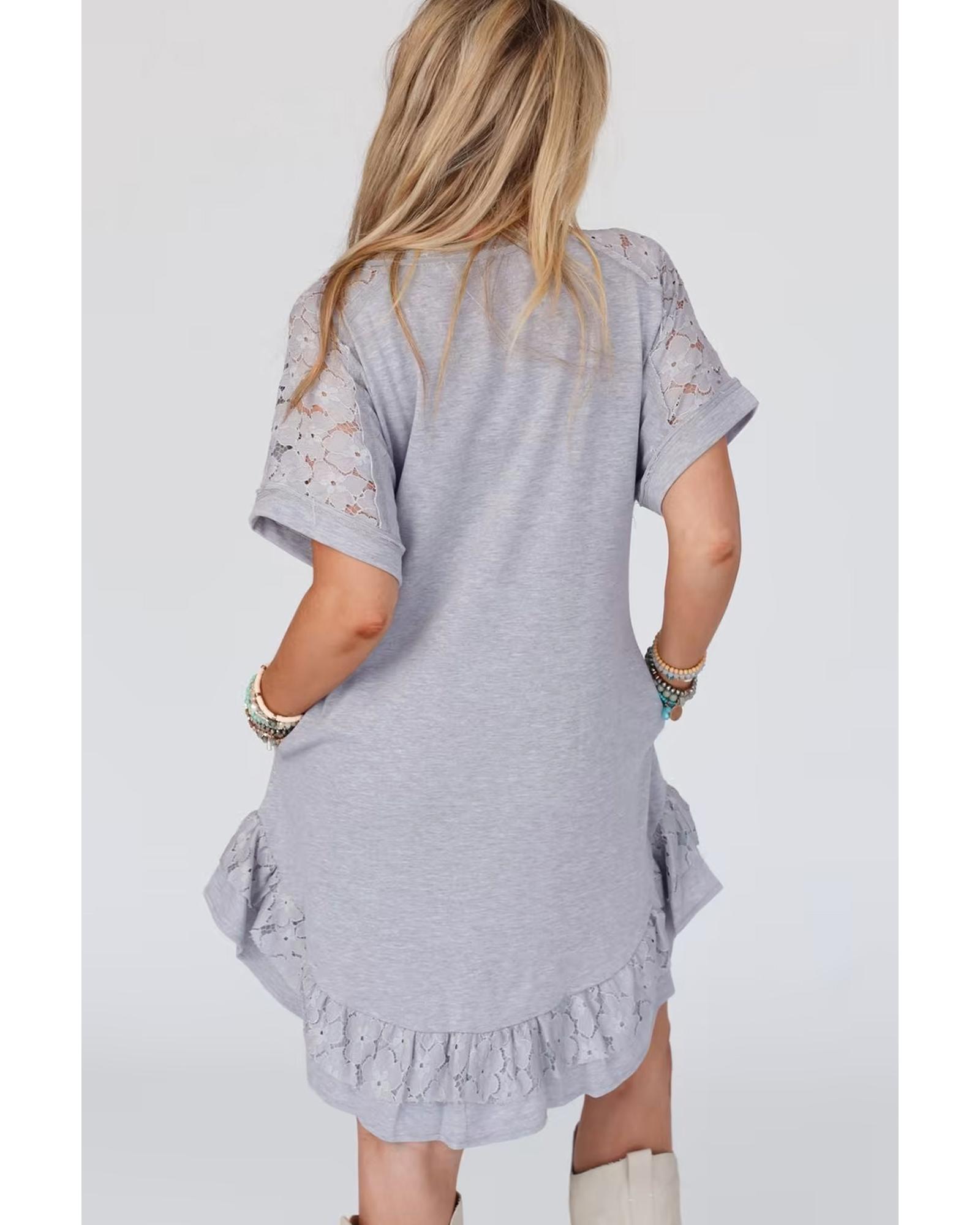 Light Grey Lace Floral Patchwork Ruffled T-shirt Dress – S