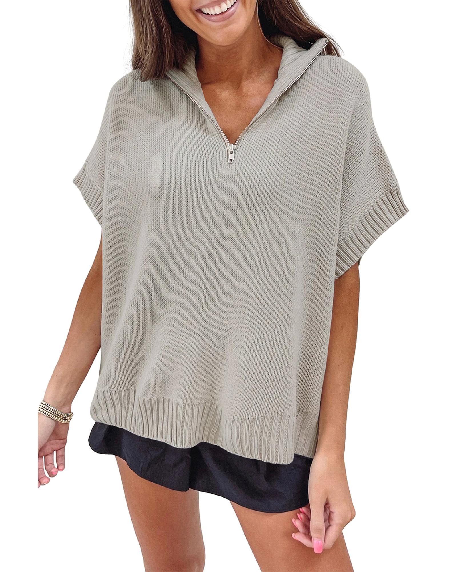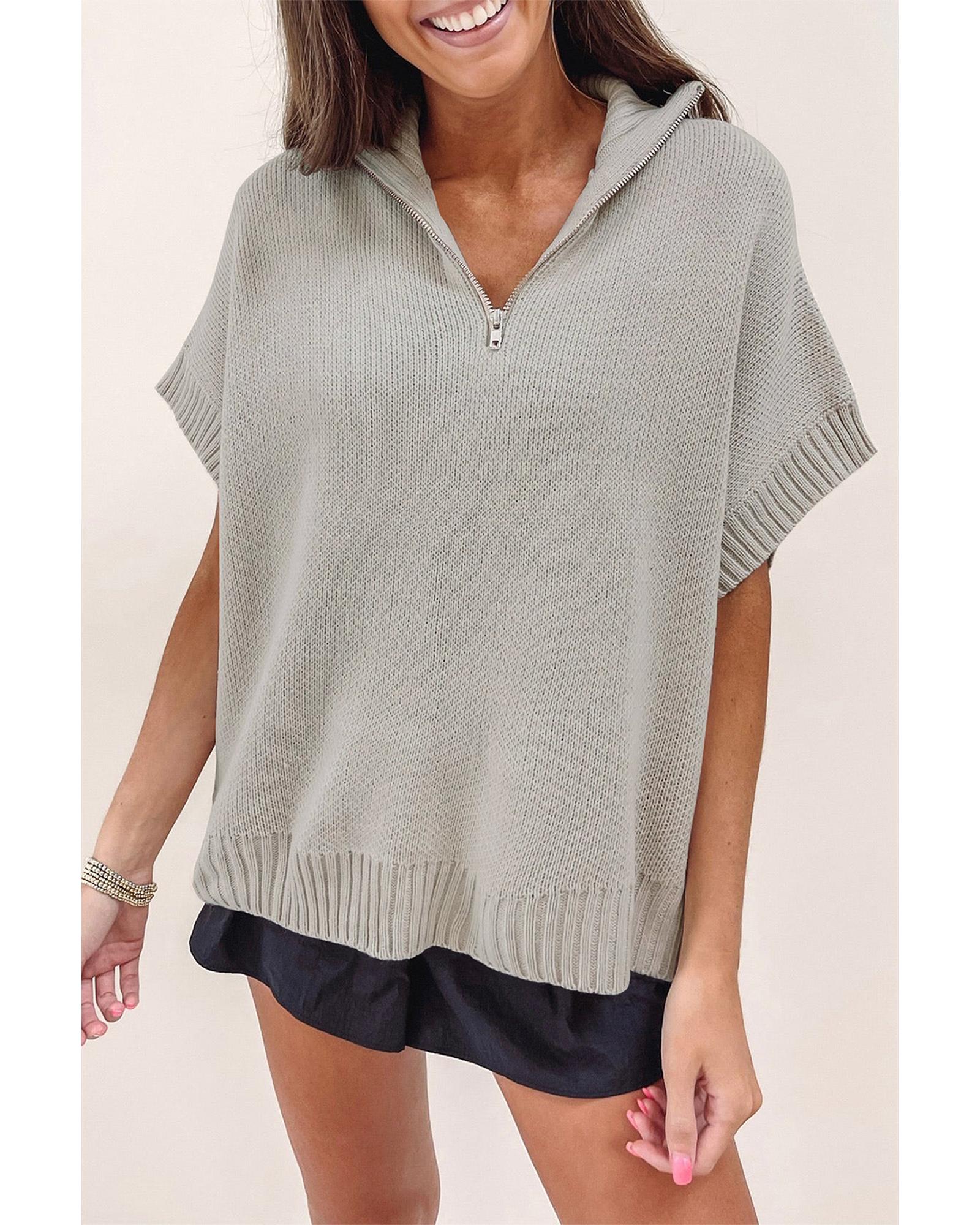 Light Grey Quarter Zip Short Batwing Sleeve Sweater – L