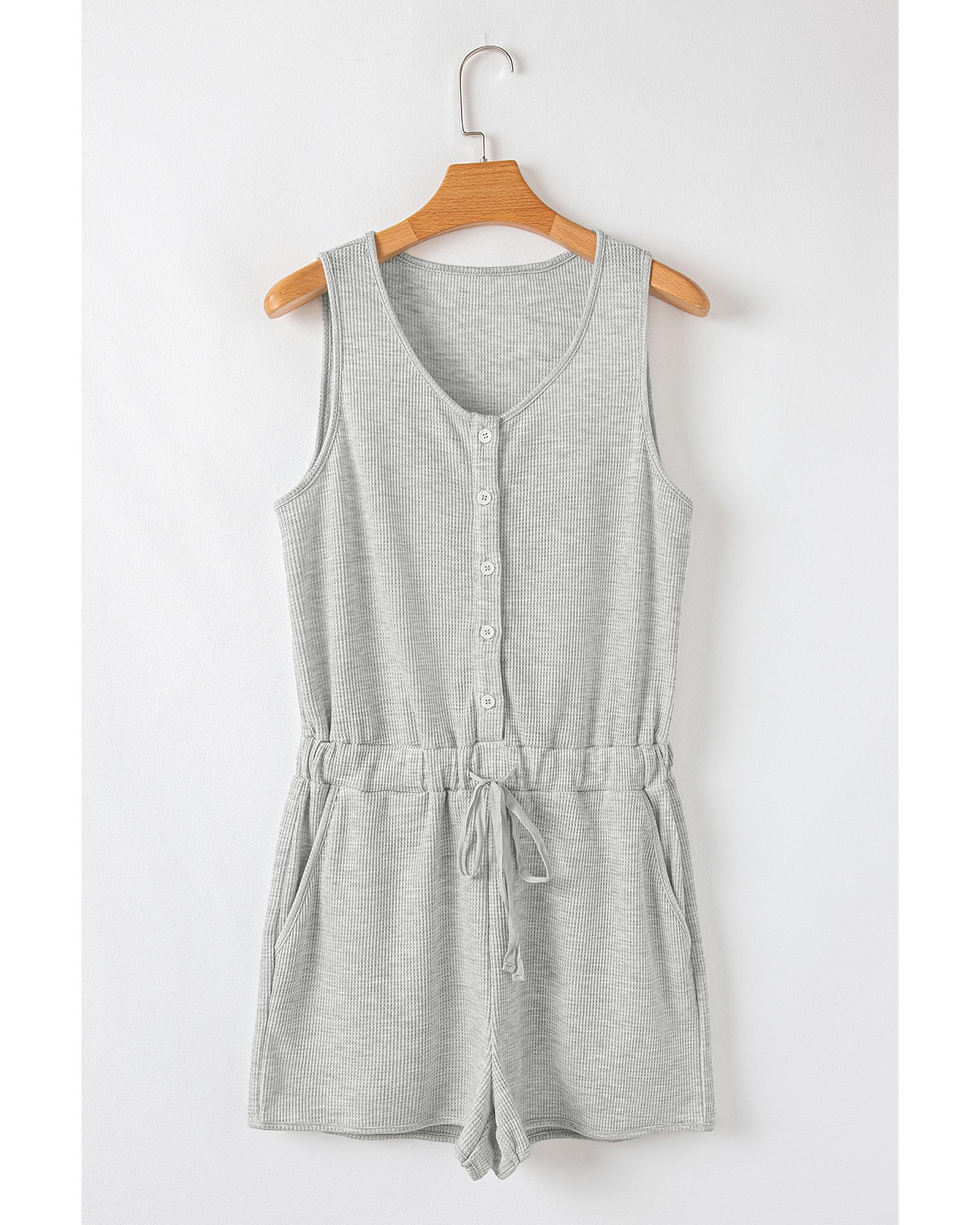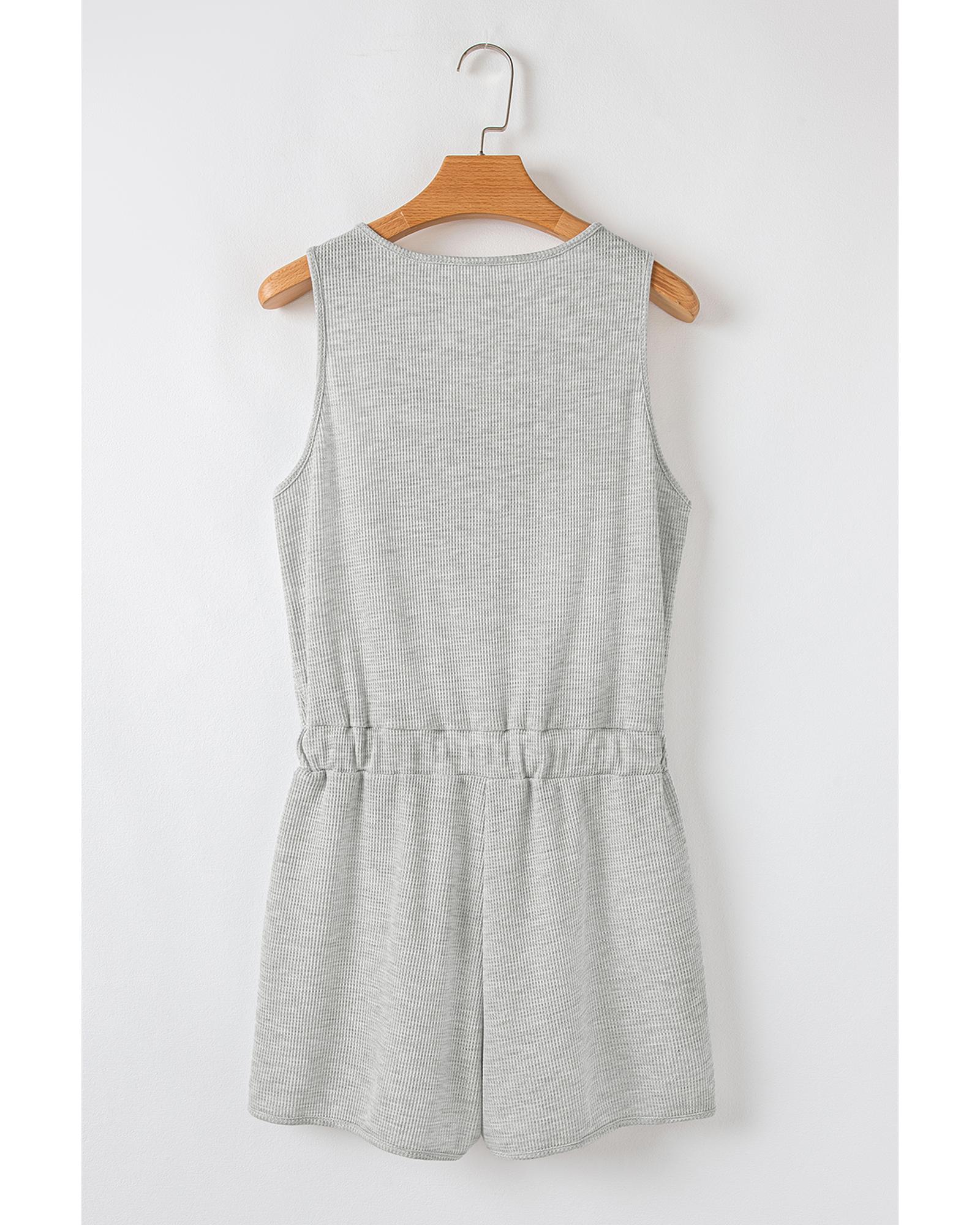 Light Grey Waffle Knit Sleeveless Buttoned Front Drawstring Waist Romper – L