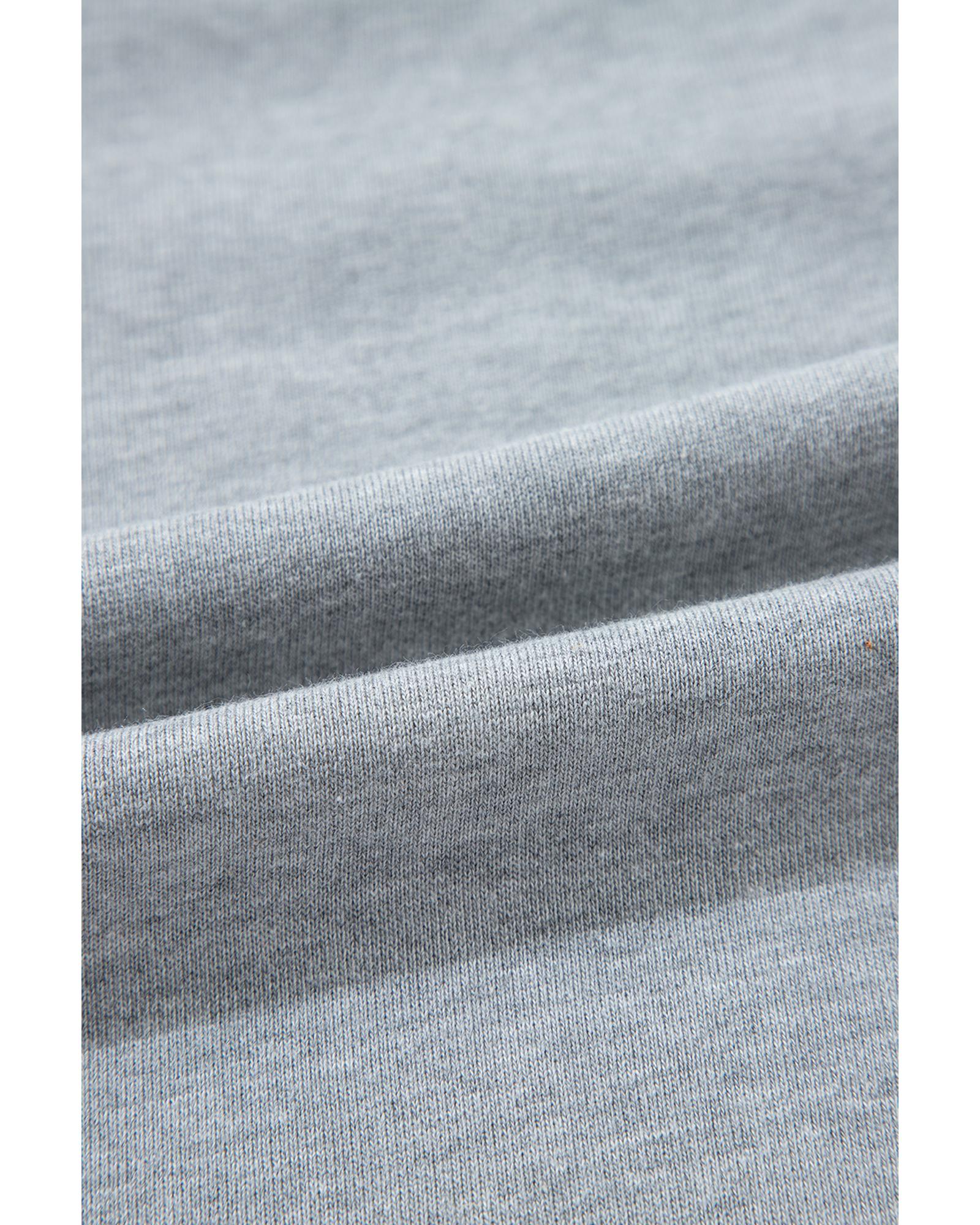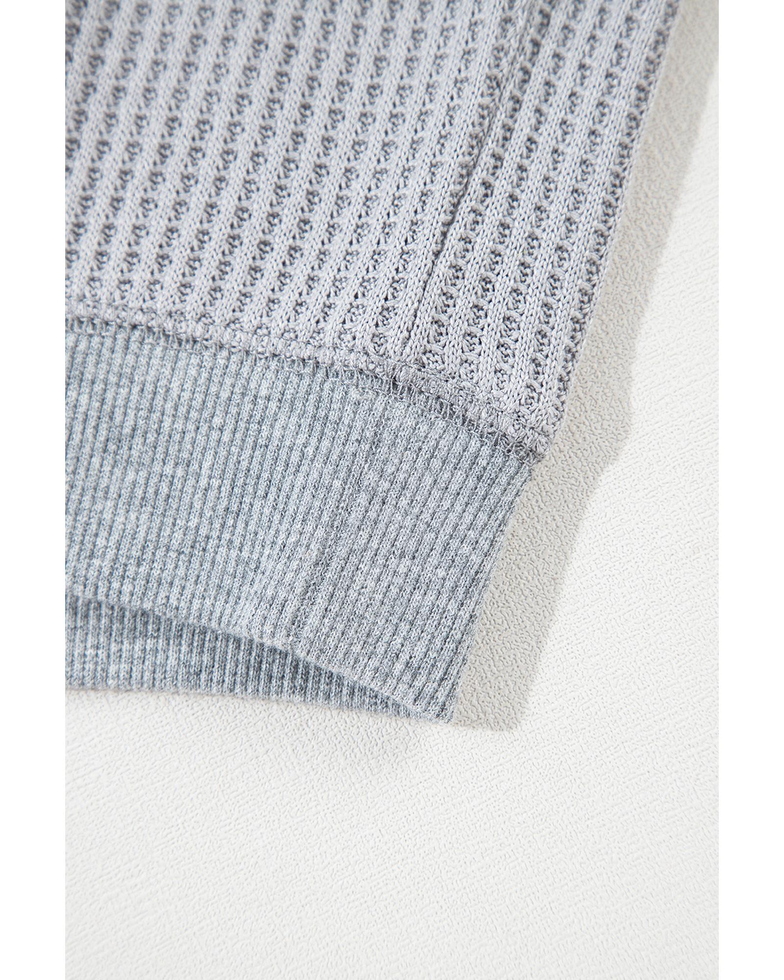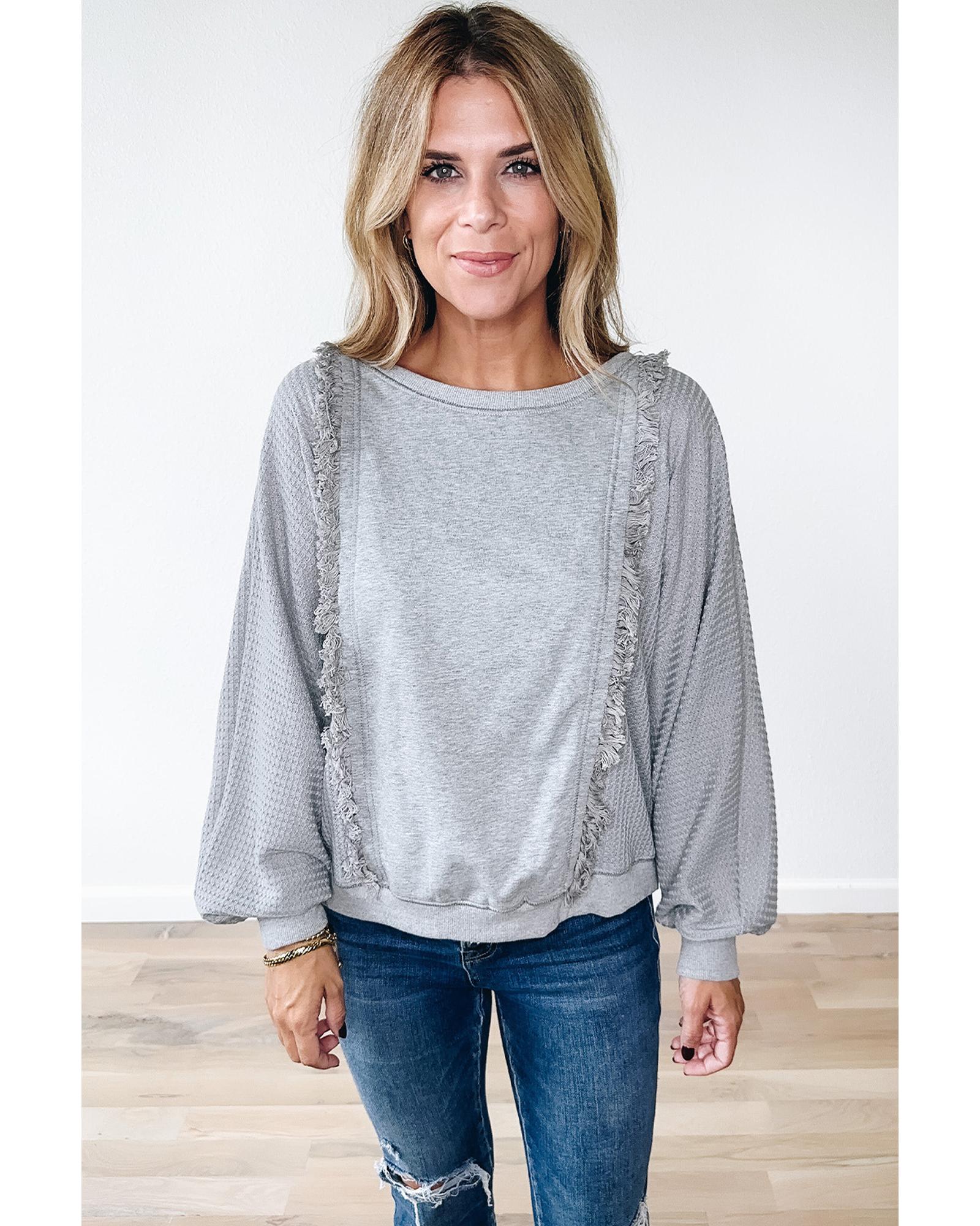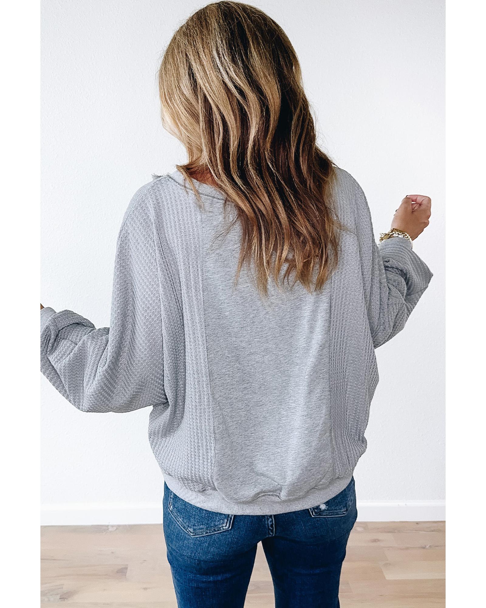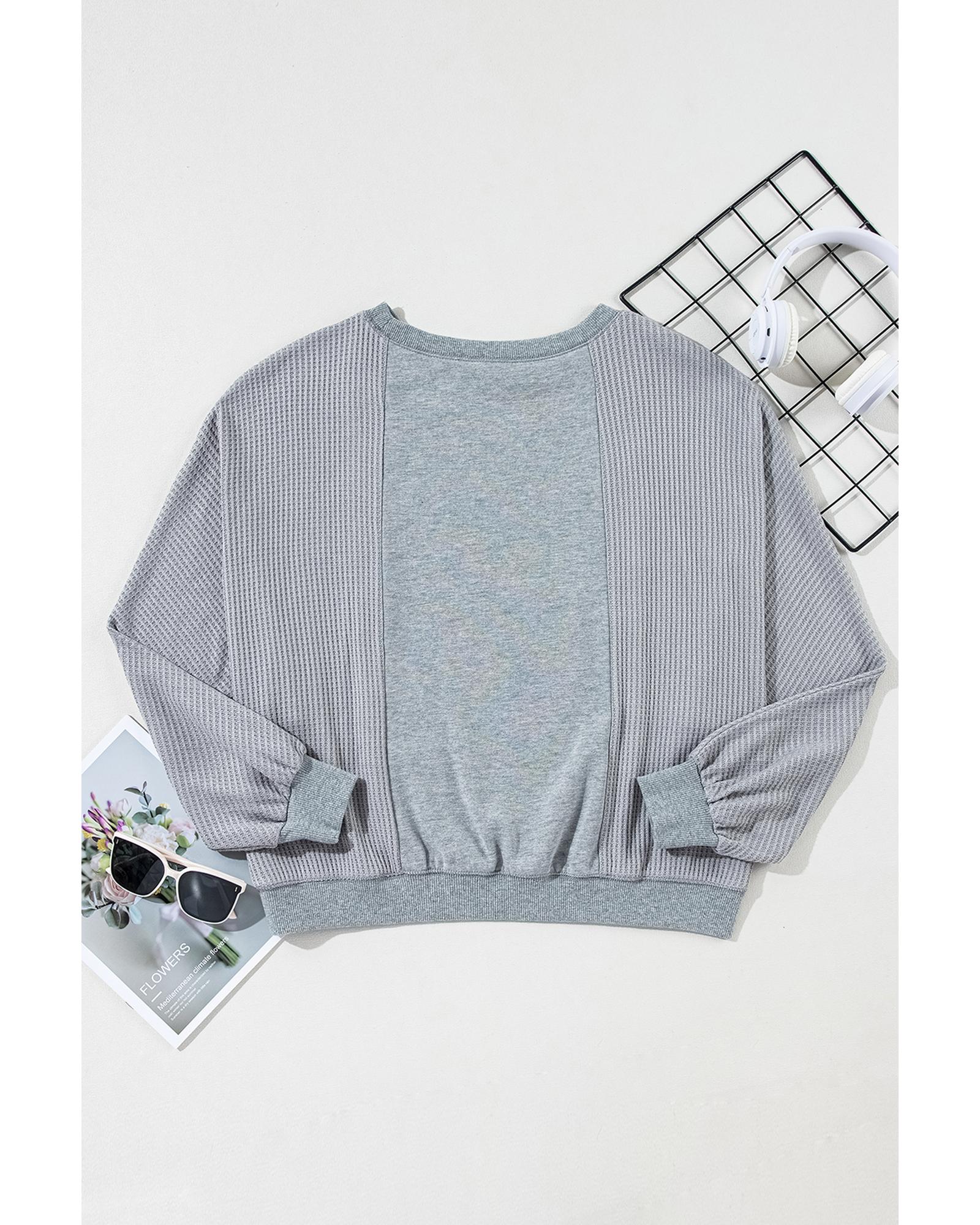 Light Grey Waffle Patchwork Long Sleeve Raw Hem Pullover Top – L