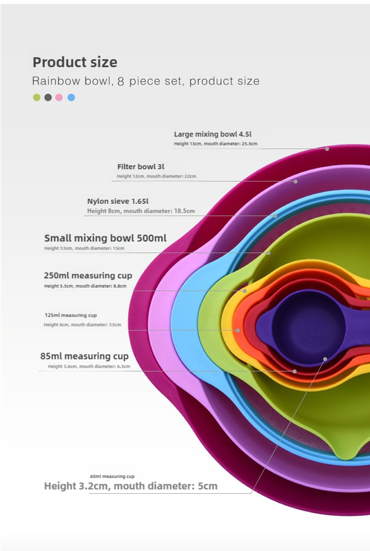 • Rainbow Mixing Bowls: A colorful set of mixing bowls of various sizes, perfect for mixing, serving, and storing. These bowls come in multiple sizes, ensuring they fit your kitchen needs.