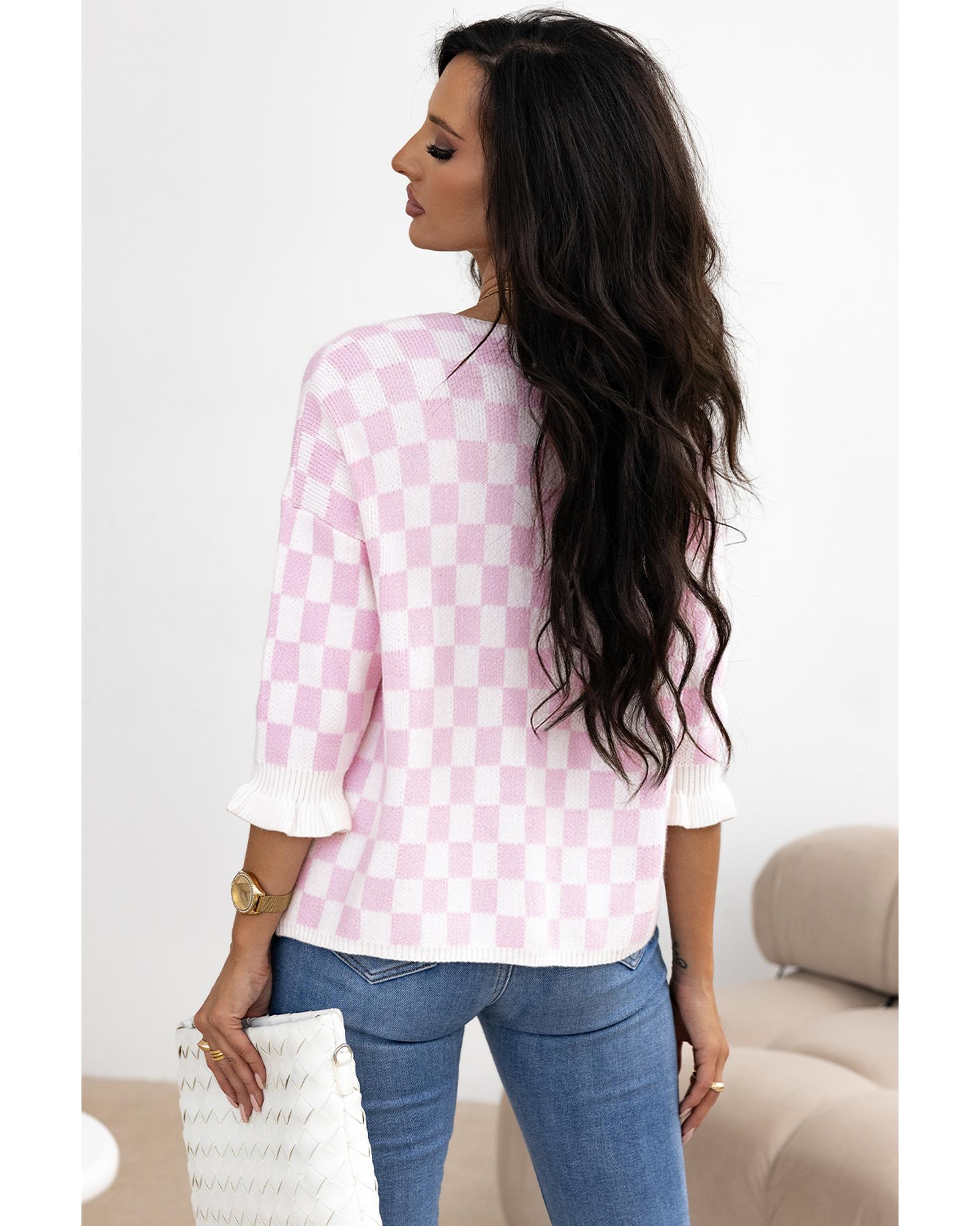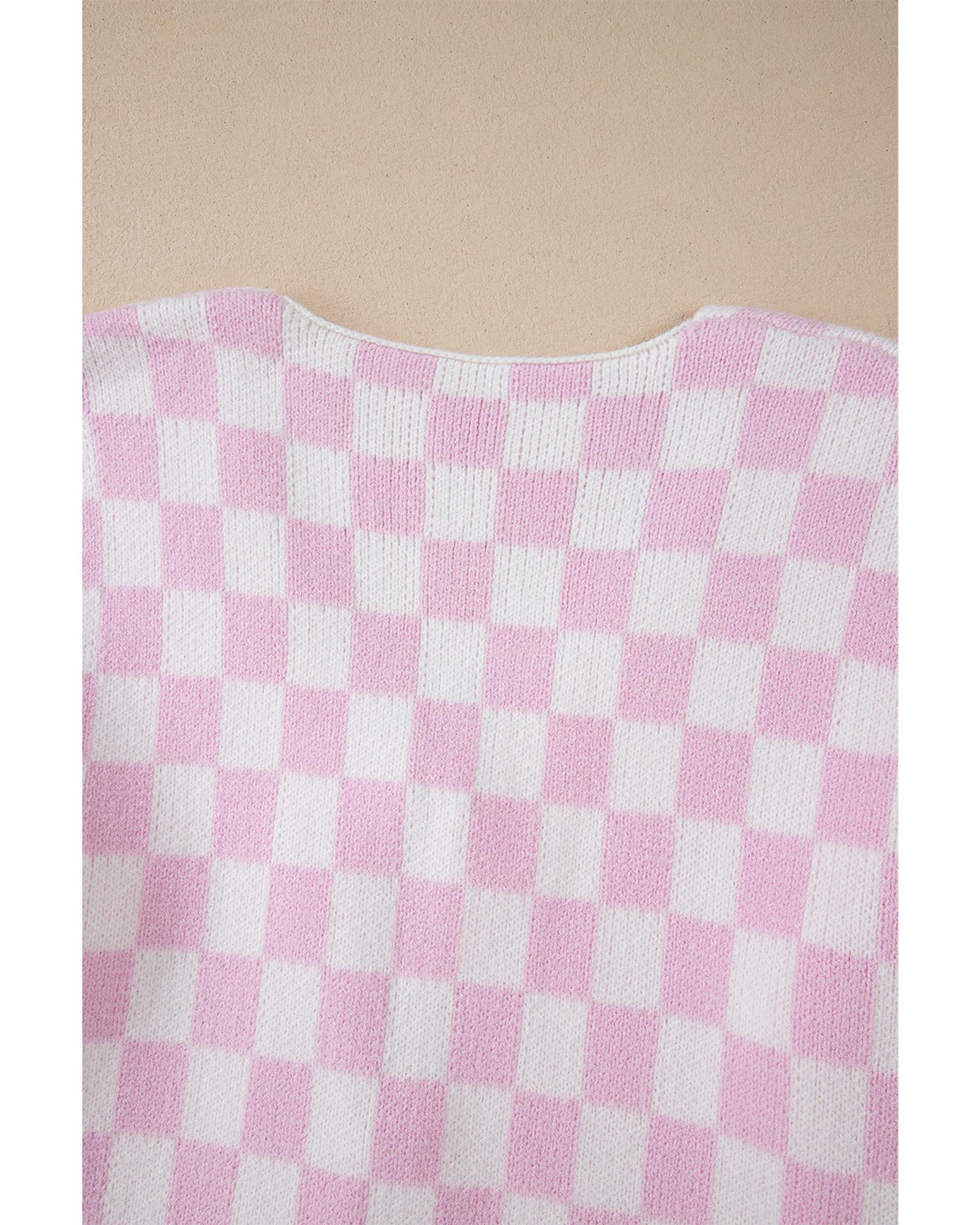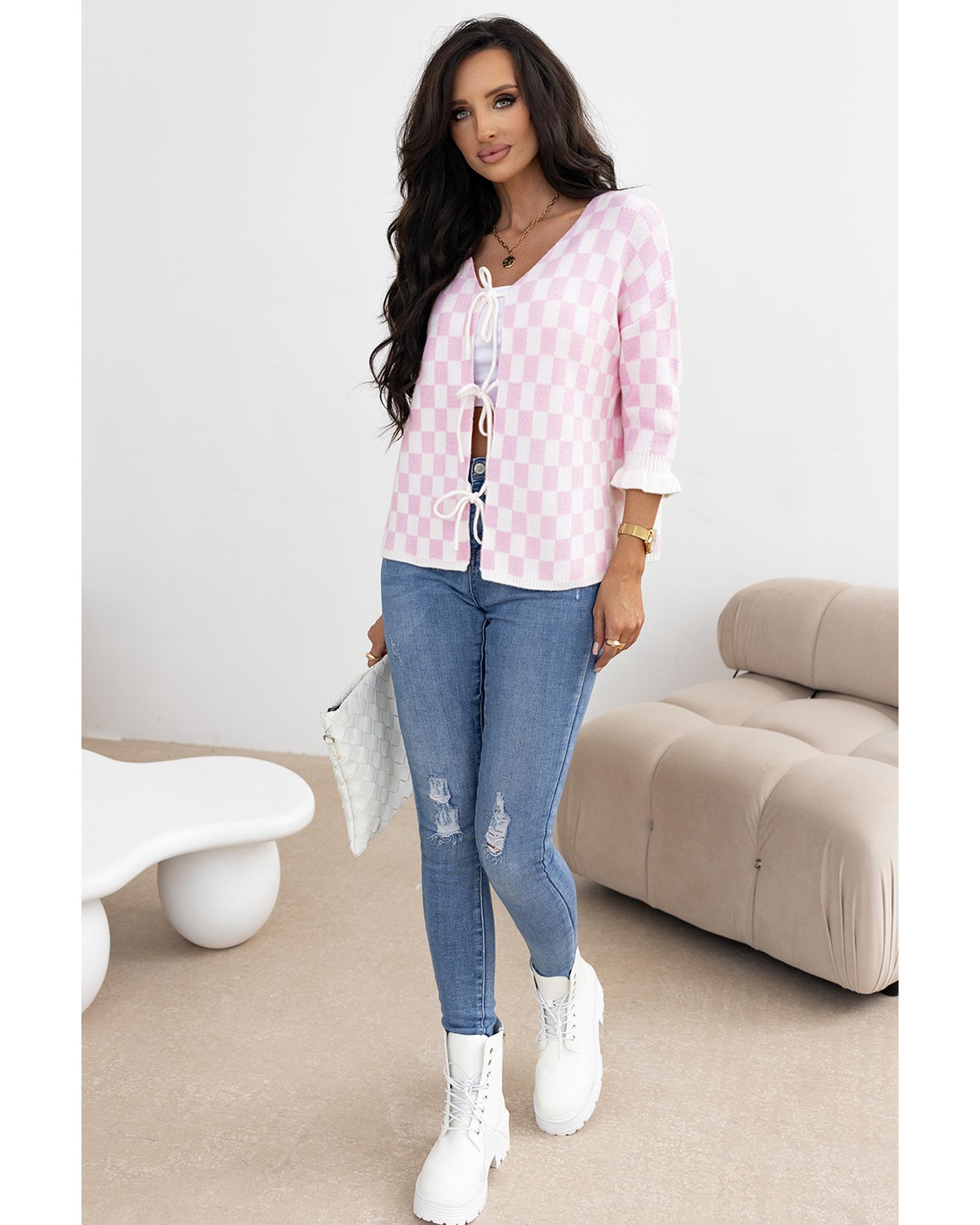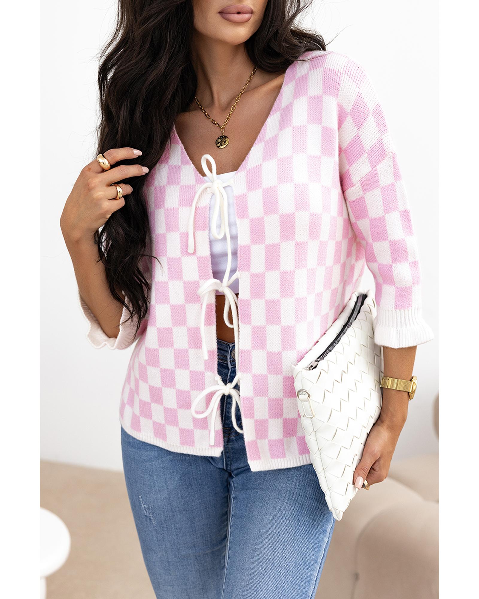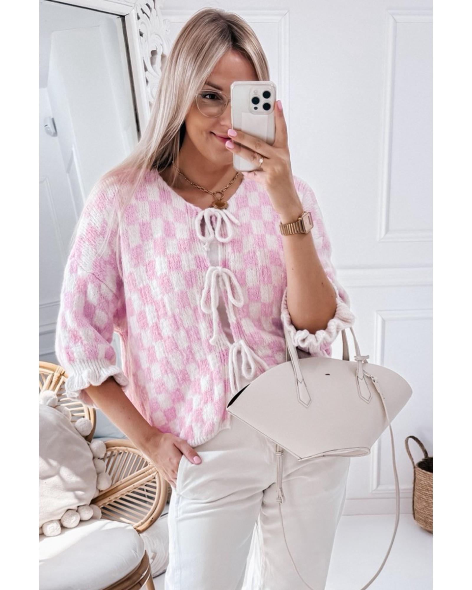 - Light pink checkered knitted cardigan