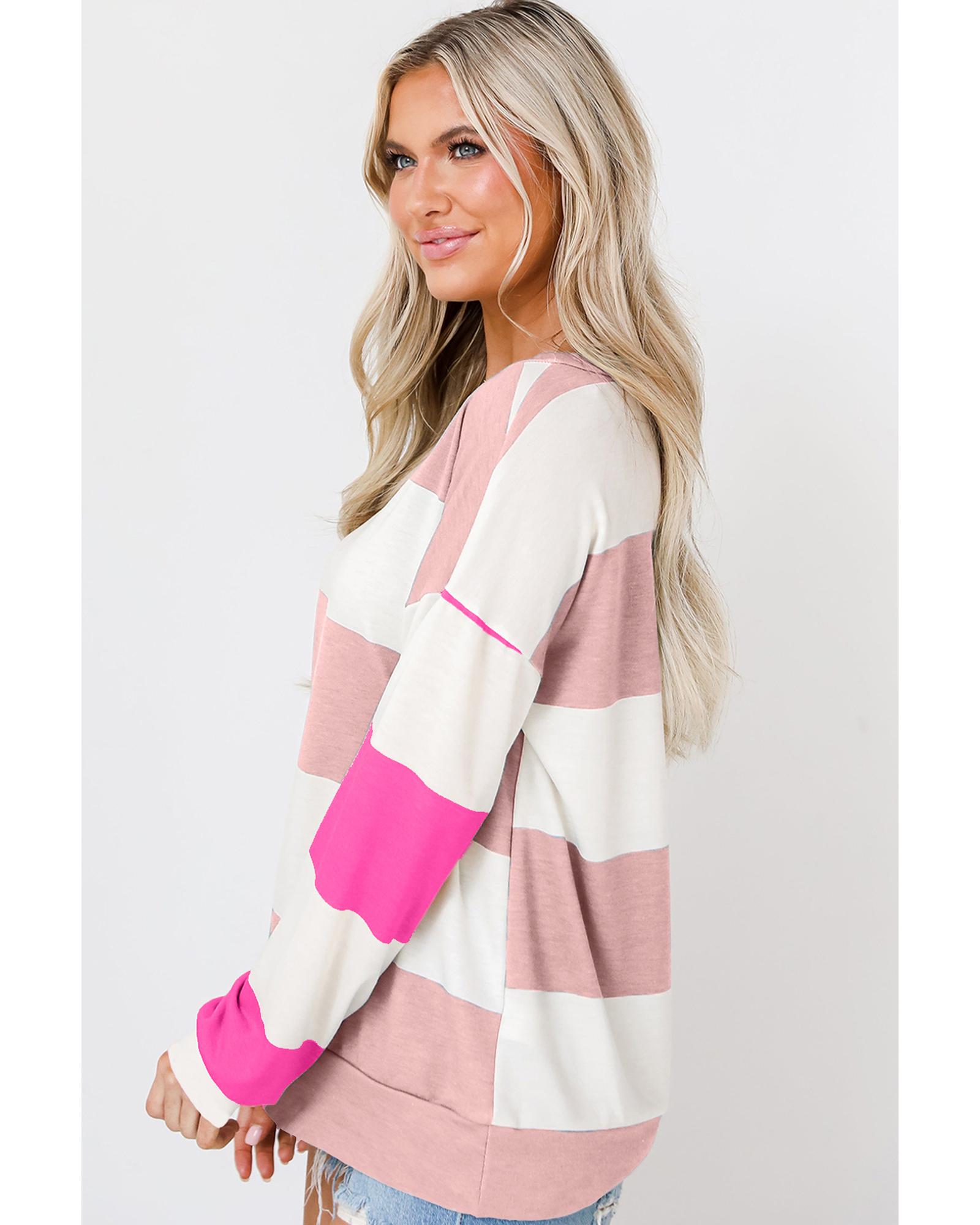 - Light Pink Colorblock Striped Drop Shoulder Long Sleeve Top