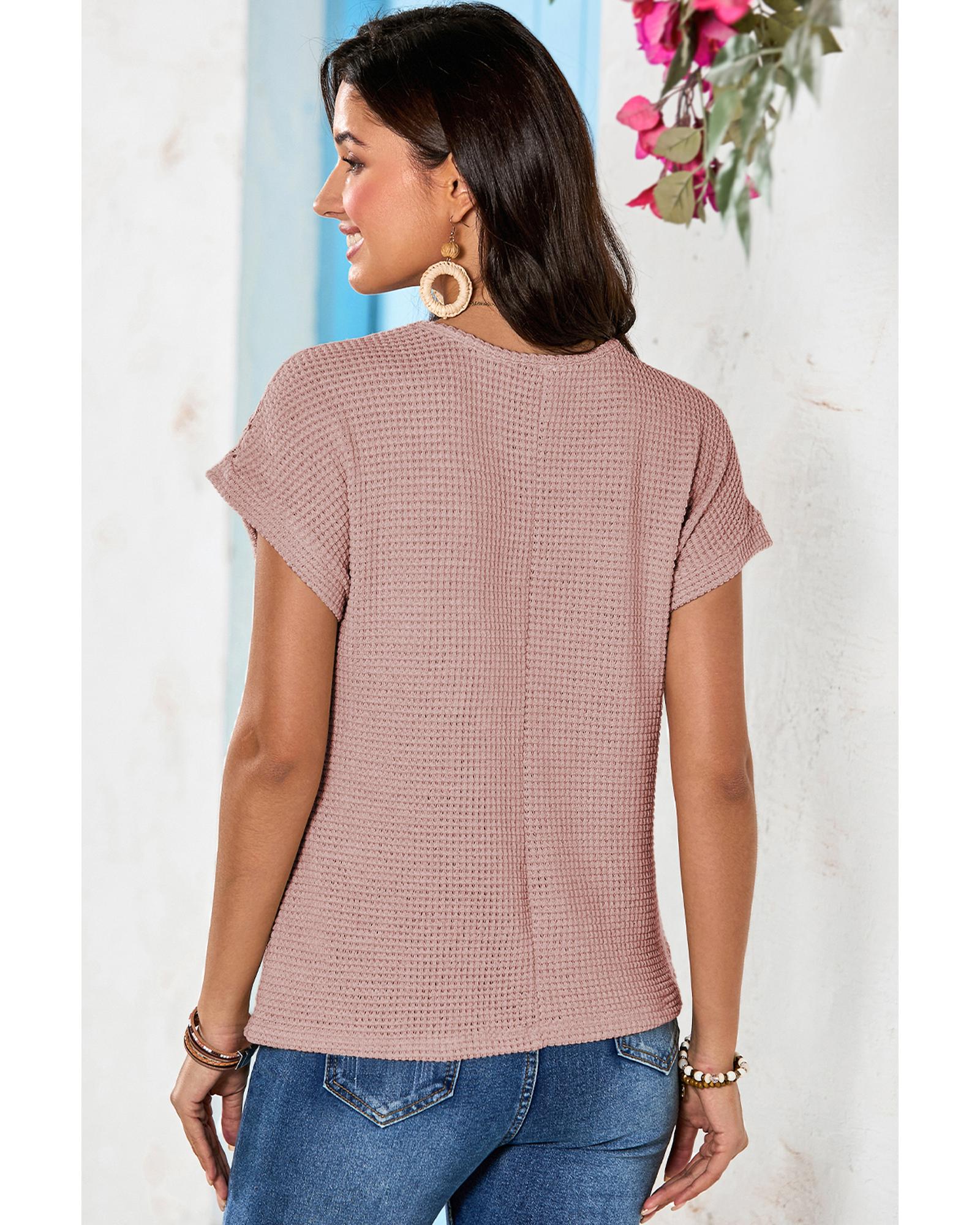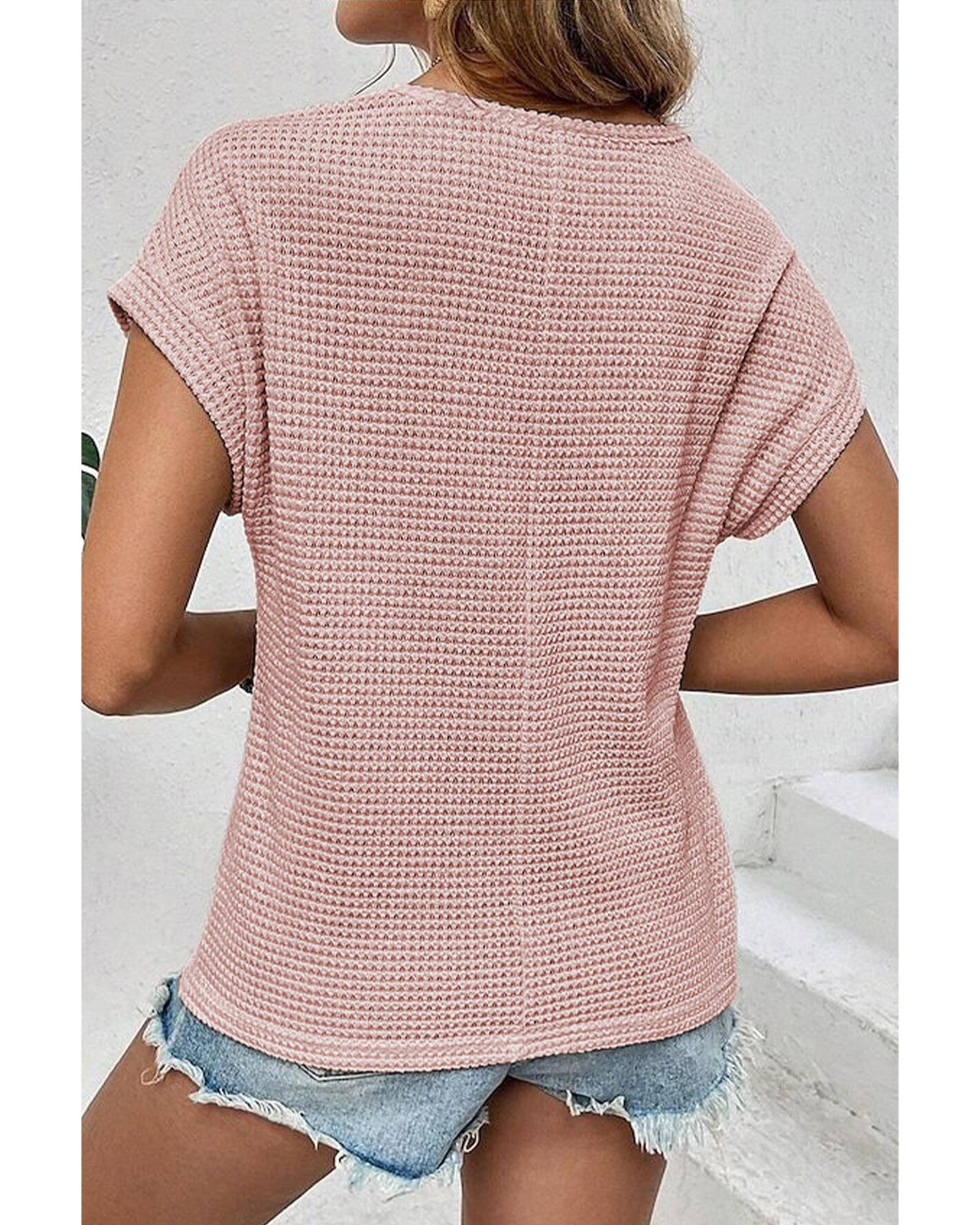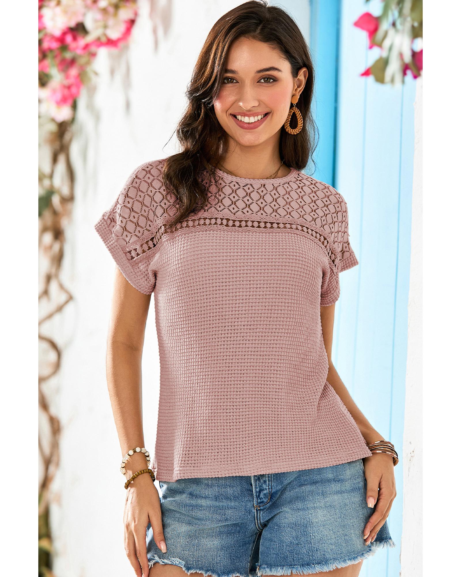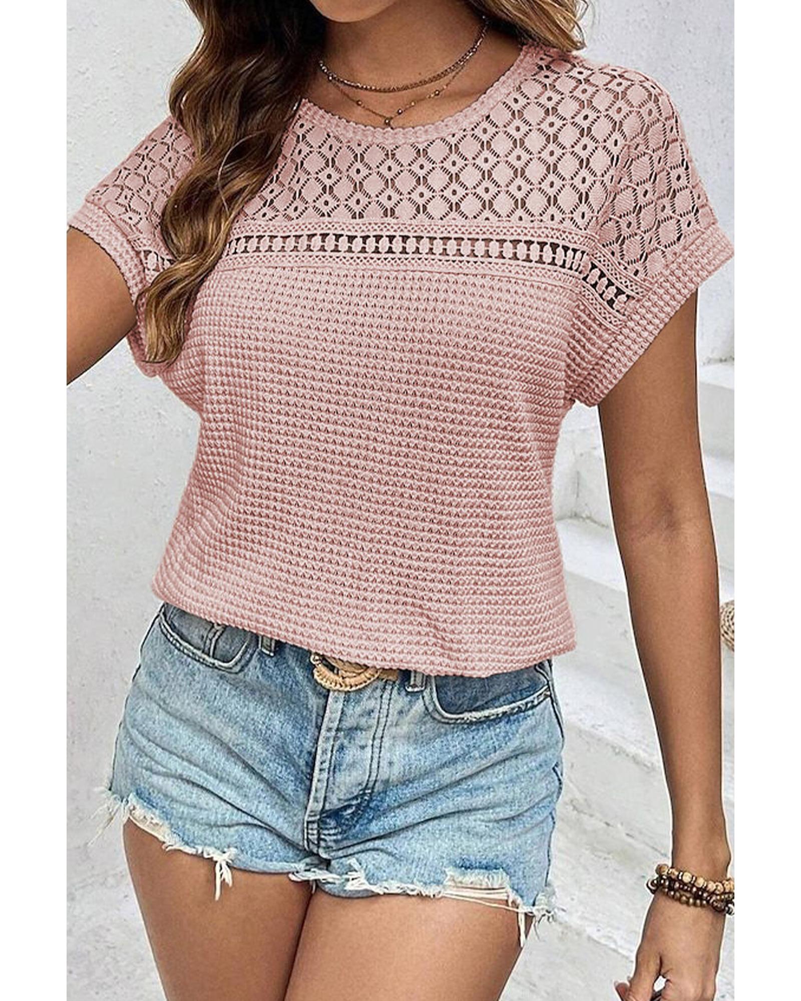 Light Pink Lace Patchwork Waffle Short Sleeve Top – S
