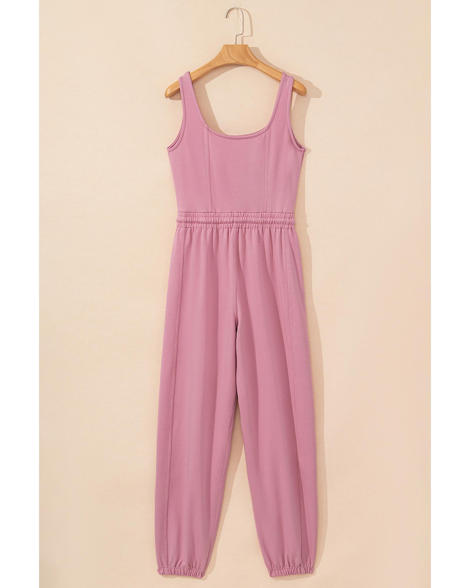 Light Pink Lace-up Elastic Waist Sleeveless Square Neck Jumpsuit – L
