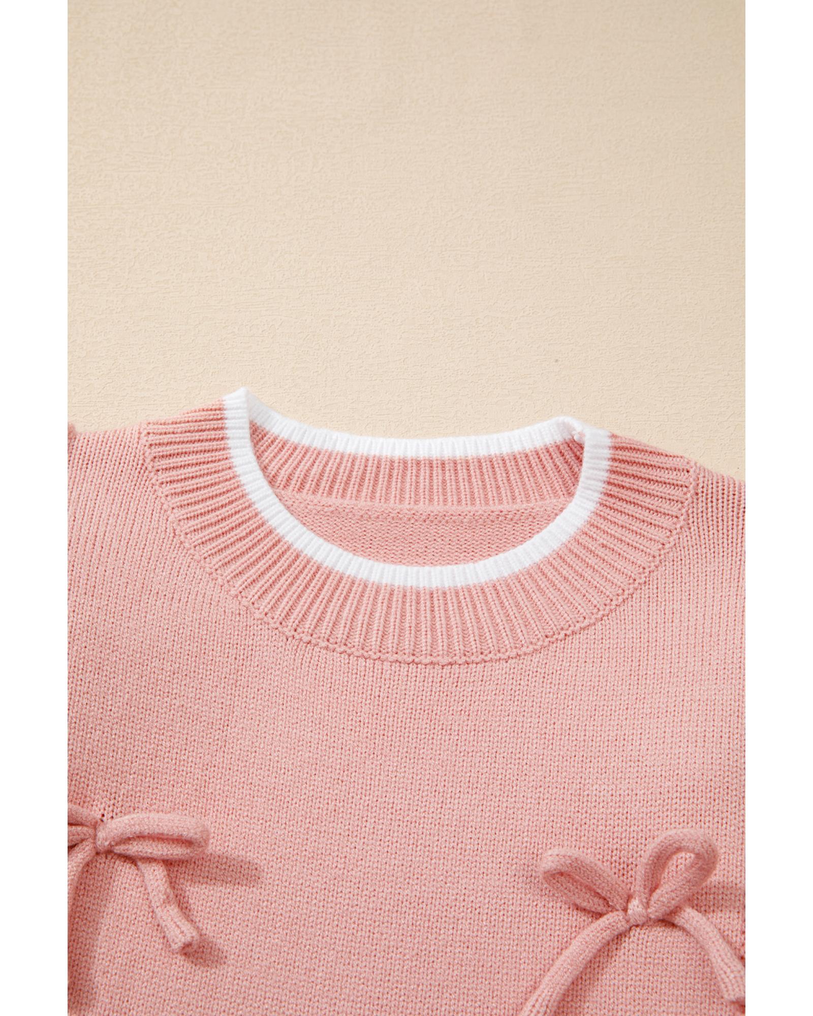 Light Pink Ruffled Bowknot Ribbed Trim Long Sleeve Sweater – S