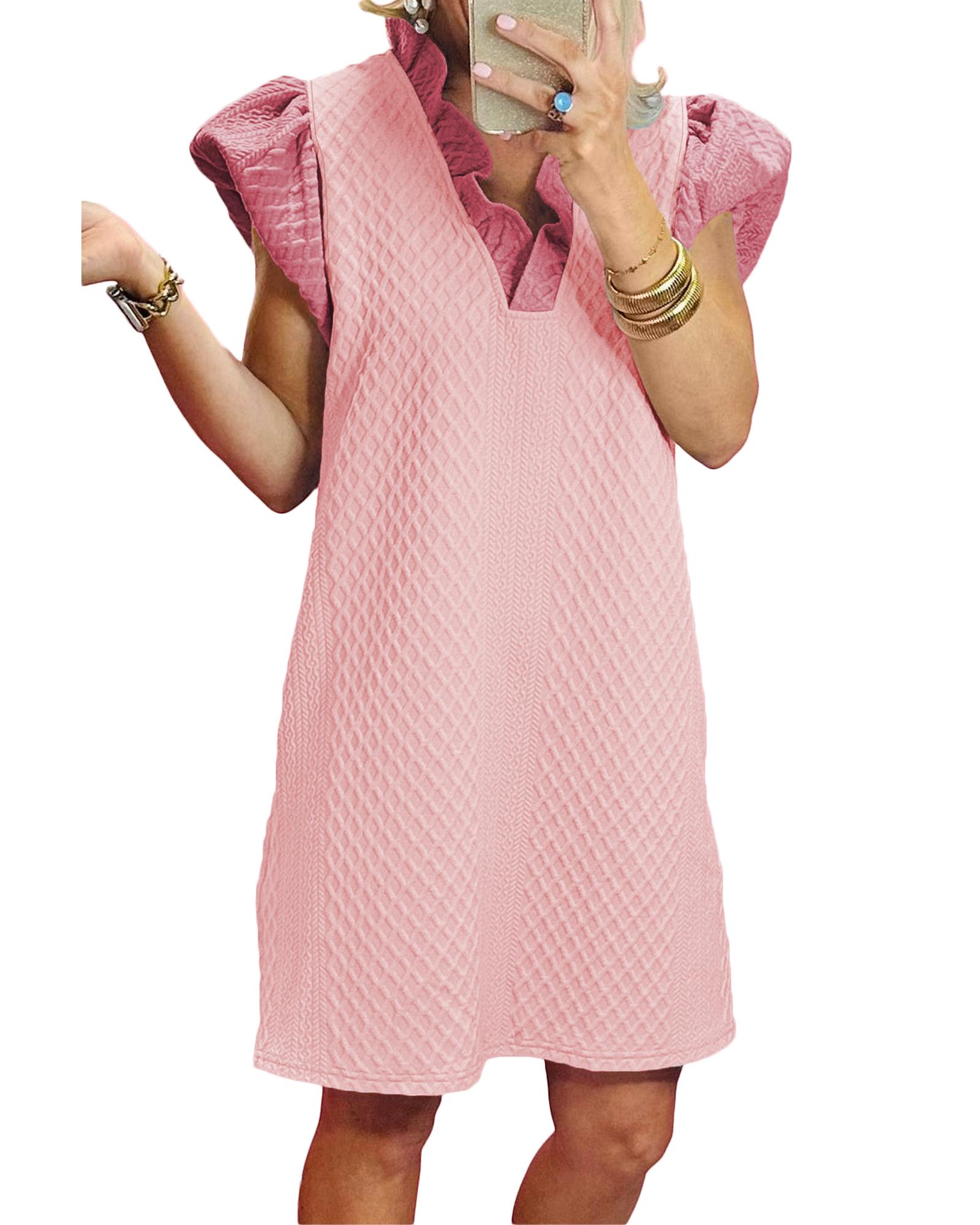 Light Pink Textured Puff Sleeve Ruffled V Neck Shift Mini Dress – M