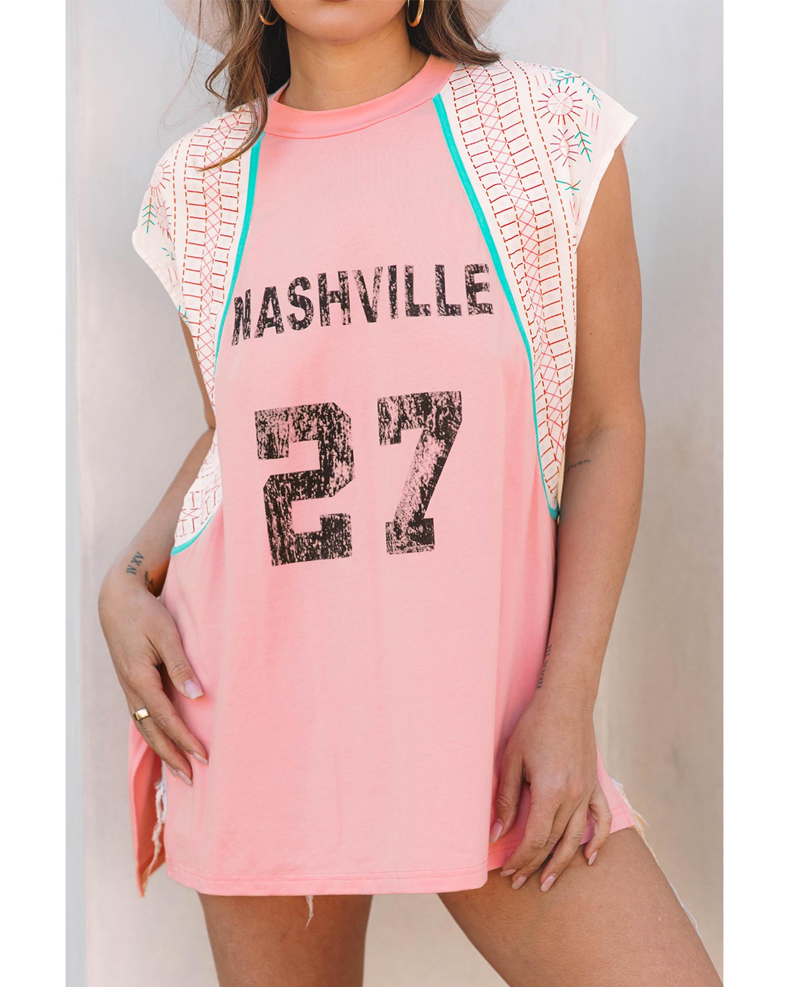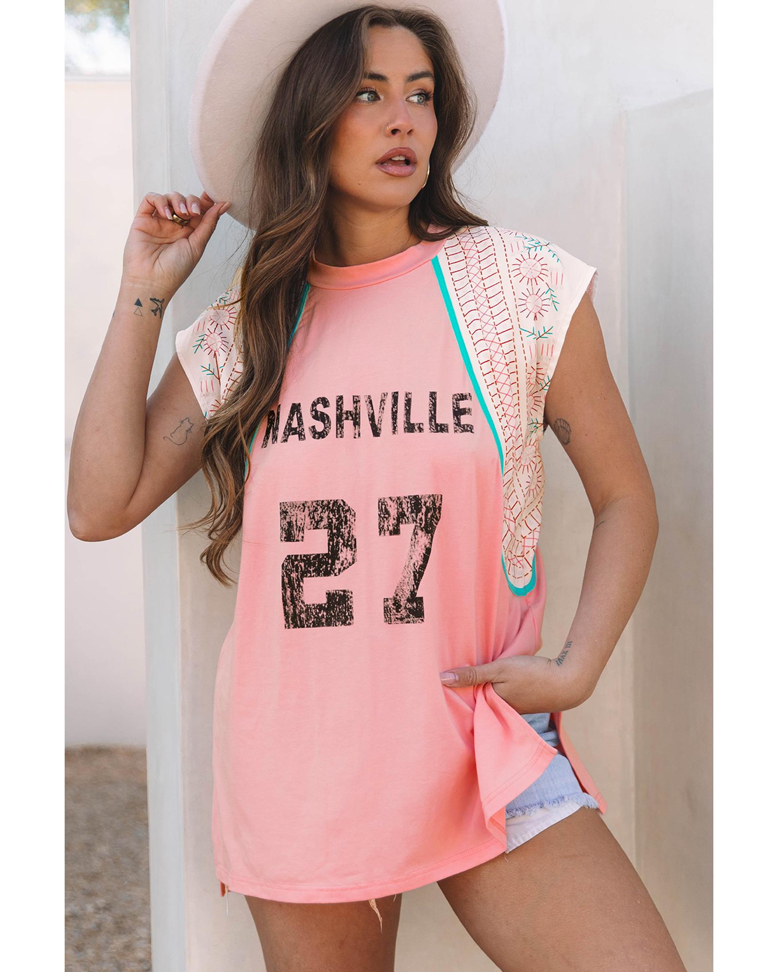 - Light Pink Vintage Nashville Printed Patchwork Tank Top
