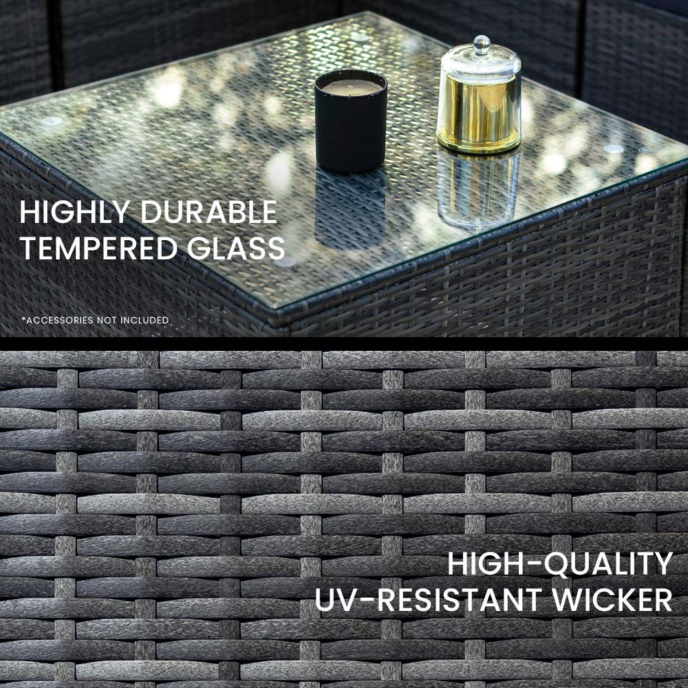 The set includes ultra-comfy 8cm thick water-resistant seat cushions, generous backrest cushioning and 2 premium throw cushions. The high-quality UV-resistant handwoven Suntech wicker in Marl Grey weave has a premium natural textured look. This is a modular design comprising two sofas, two corner sofas, an ottoman, plus a coffee table with tempered glass table top. You can set it up in whatever configuration works best for you, making this London Rattan outdoor lounge setting a great addition to any outdoor space.