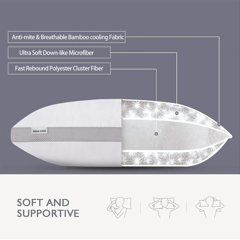 Cover is Bamboo blend; filling is polyester; medium to firm profile; pack includes 2 x pillows; air mesh gusset, 1kg ultra soft down-like microfibre fill for each pillow, higher loft supports your neck and head; fast rebound with 5 seconds, vacuum packed; dimension 45x70x16cm;