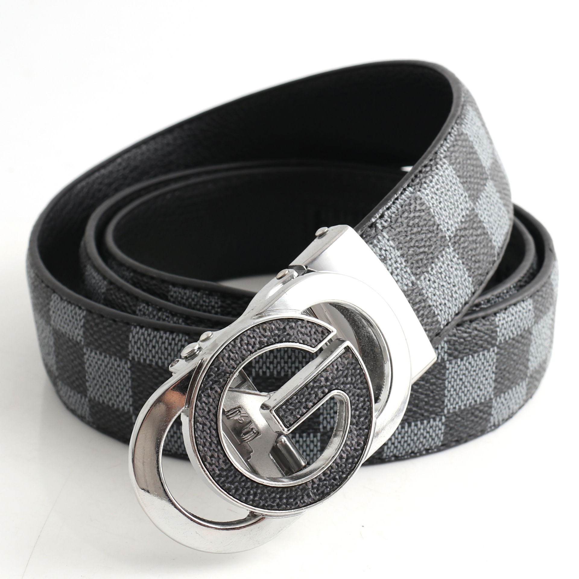 Luxury Designer Style PU Leather Belt,Automatic Buckle(G-patterned black-gray belt + silver buckle)