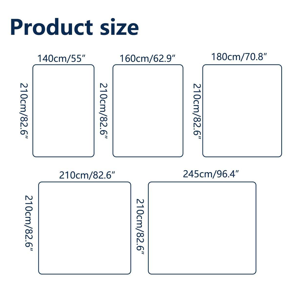 • Queen: 210 x 210 cm