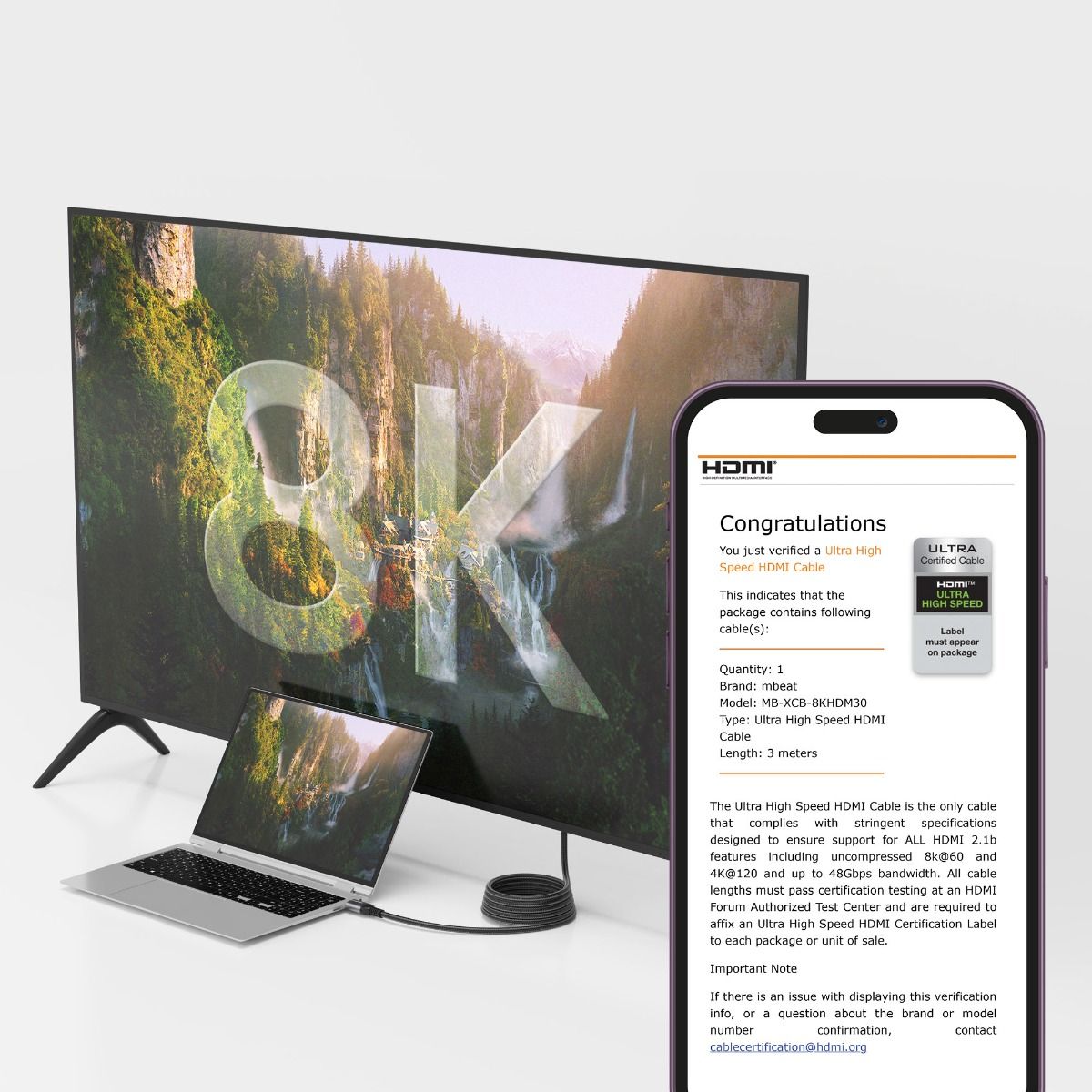 The mbeat Tough Link Certified 8K HDMI 2.1 cable provides stunning visuals and smooth performance for gaming and entertainment. With broad device compatibility and a durable, reliable design, it ensures seamless, high-quality connections for all your HDMI-enabled devices.