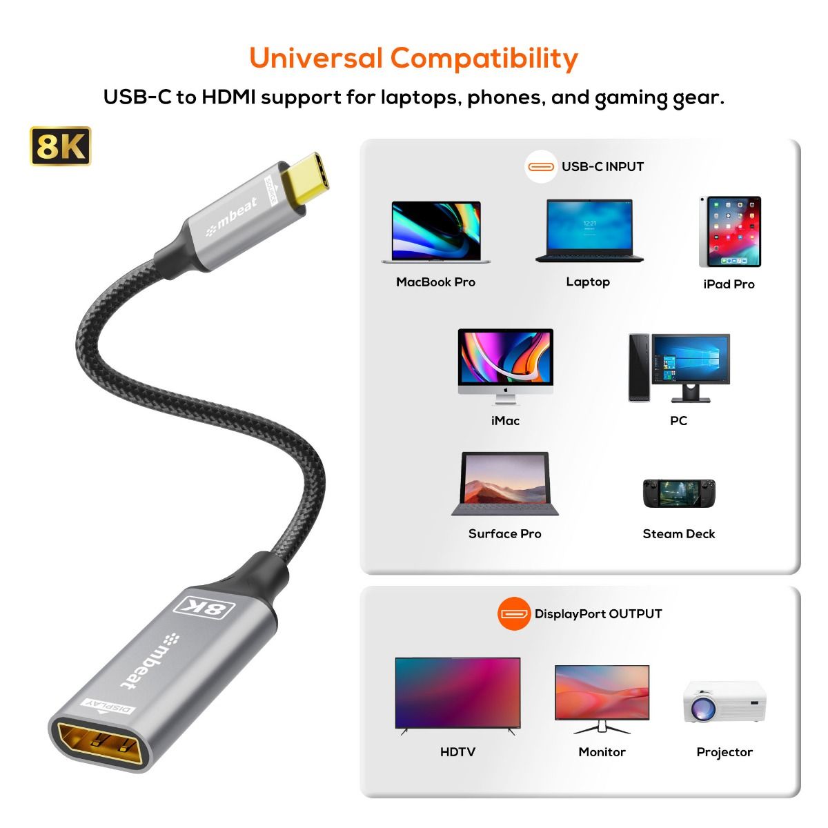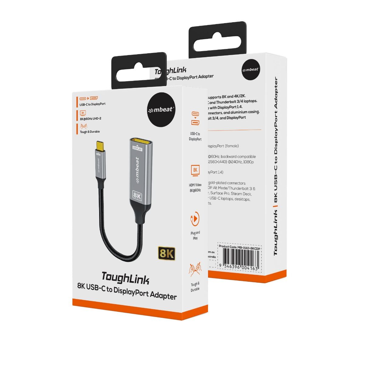 The mbeat Tough Link 8K USB-C to DisplayPort Adapter supports 8K@60Hz, multi-screen functionality, and smooth video with DisplayPort 1.4. It features a durable nylon cable, gold-plated connectors, and broad compatibility with USB-C and Thunderbolt devices.