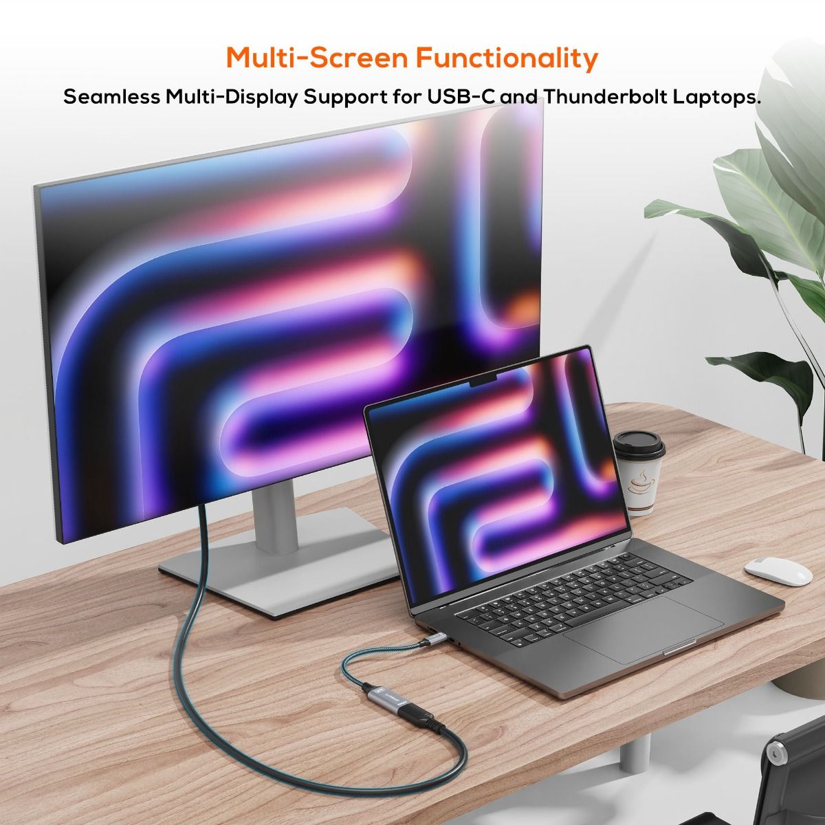 The adapter enables HDMI extension on USB-C and Thunderbolt 3 4 laptops, supporting both mirrored and extended modes for flexible multitasking, work, or entertainment.