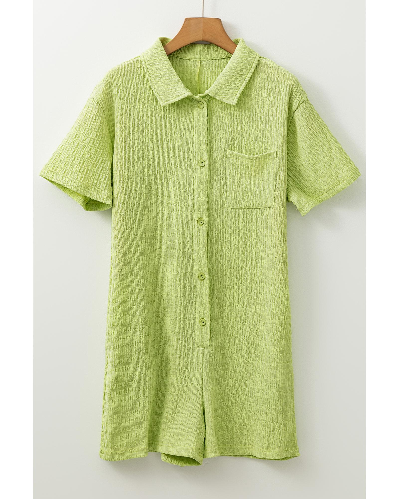 Meadow Mist Green Textured Short Sleeve Patched Pocket Buttoned Shirt Romper - XL
