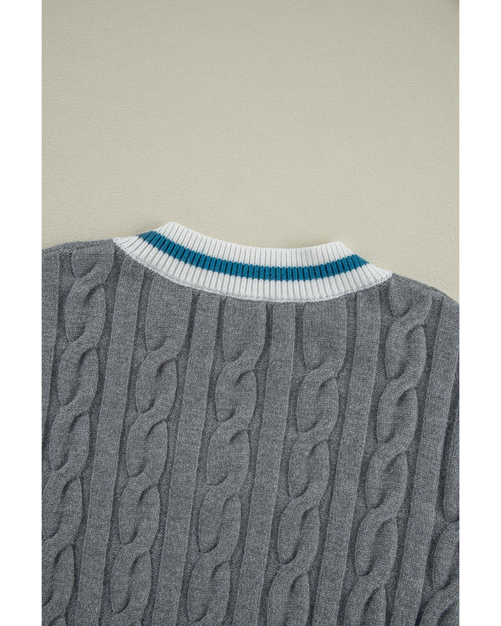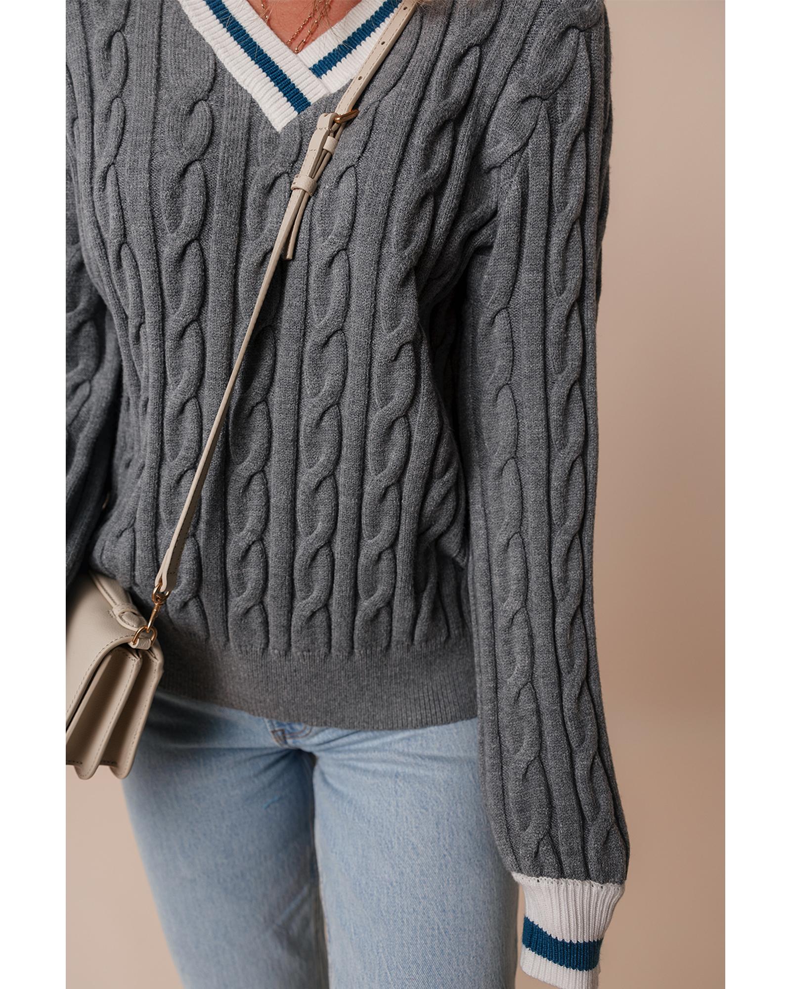 Medium Grey Color Contrast Ribbed Edge Cable Knit V Neck Sweater – XL