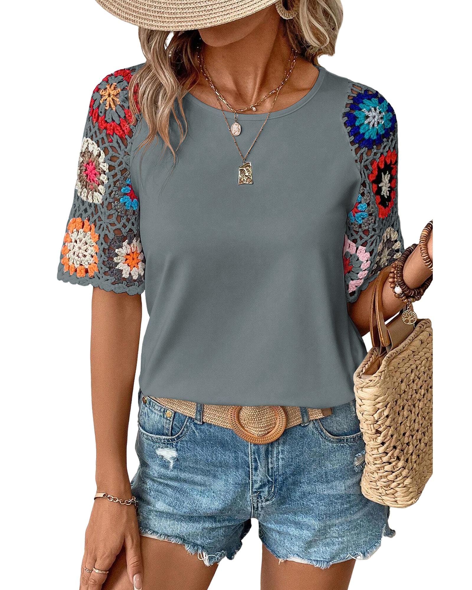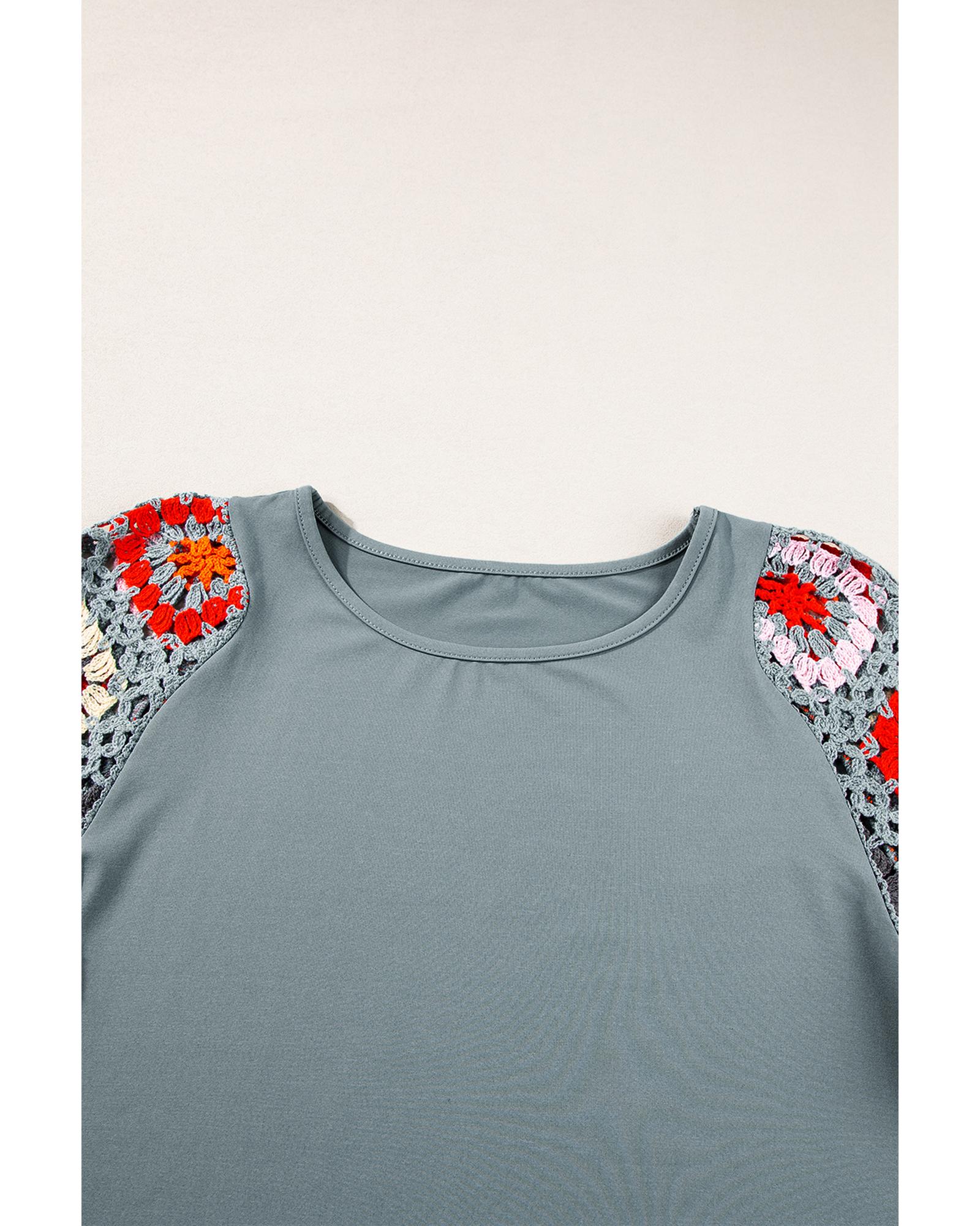 Medium Grey Floral Crochet Short Sleeve Top – S