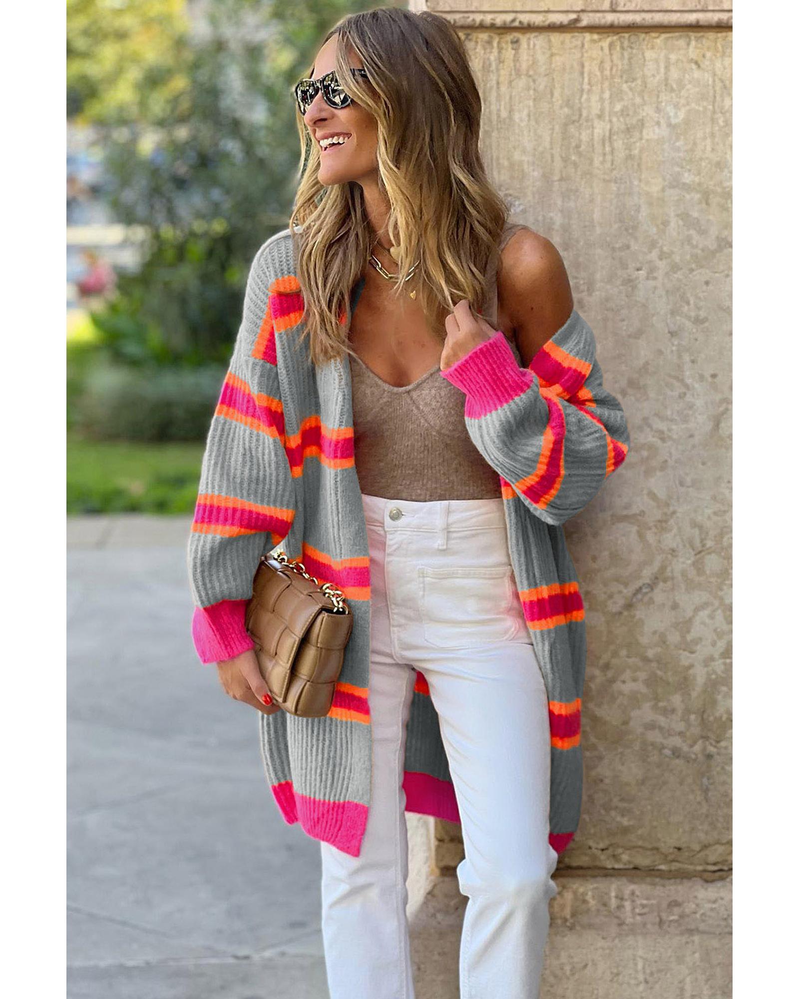 - Medium Grey Stripe Printed Ribbed Long Knitted Cardigan