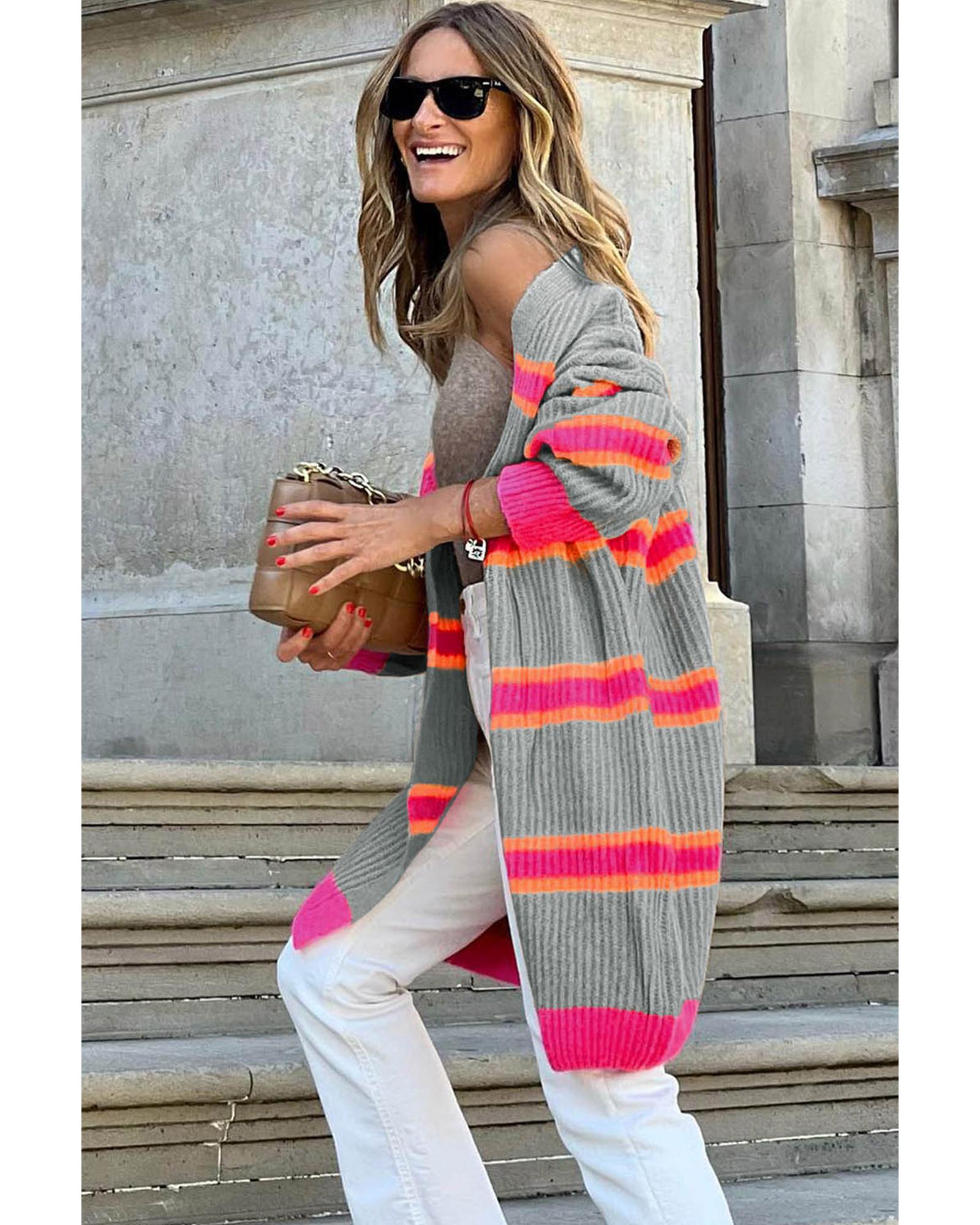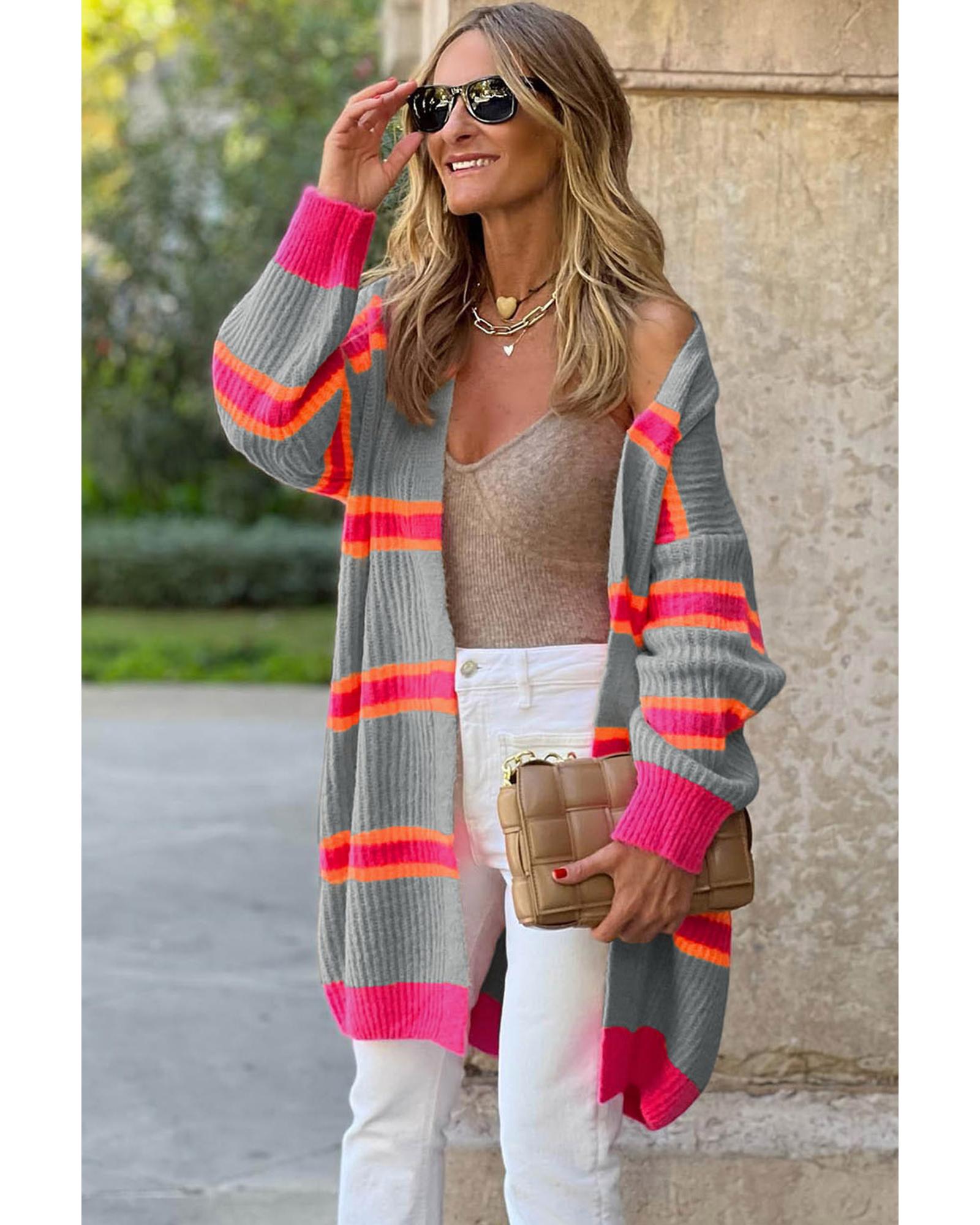 • Medium Grey Stripe Printed Ribbed Long Knitted Cardigan