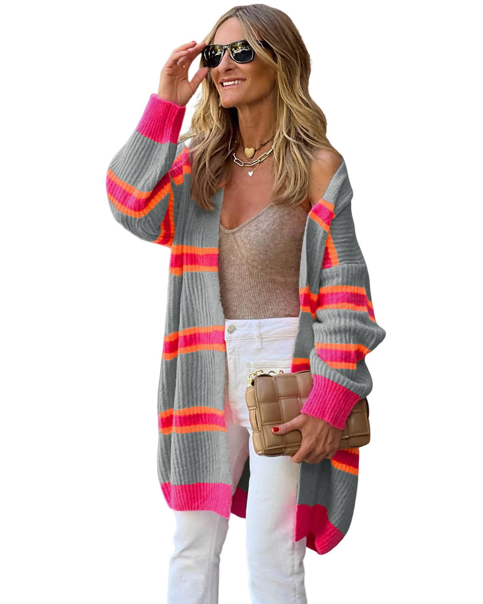 - Medium Grey Stripe Printed Ribbed Long Knitted Cardigan