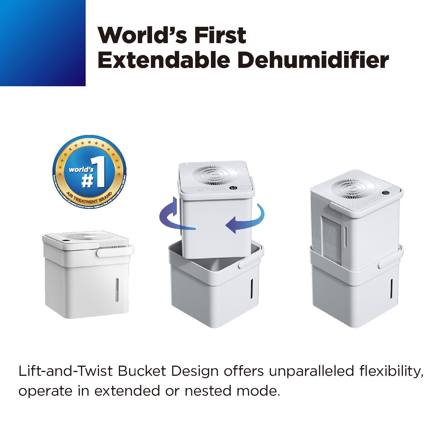 The Midea Cube dehumidifier has a unique lift-and-twist design that offers unparalleled flexibility: when operating in extended form, it has up to 3 times more water tank capacity than traditional dehumidifiers and can run much longer without the hassle of frequently emptying the tank; when in nested or drain form, the unit is half the size allowing compact storage or flexible draining.