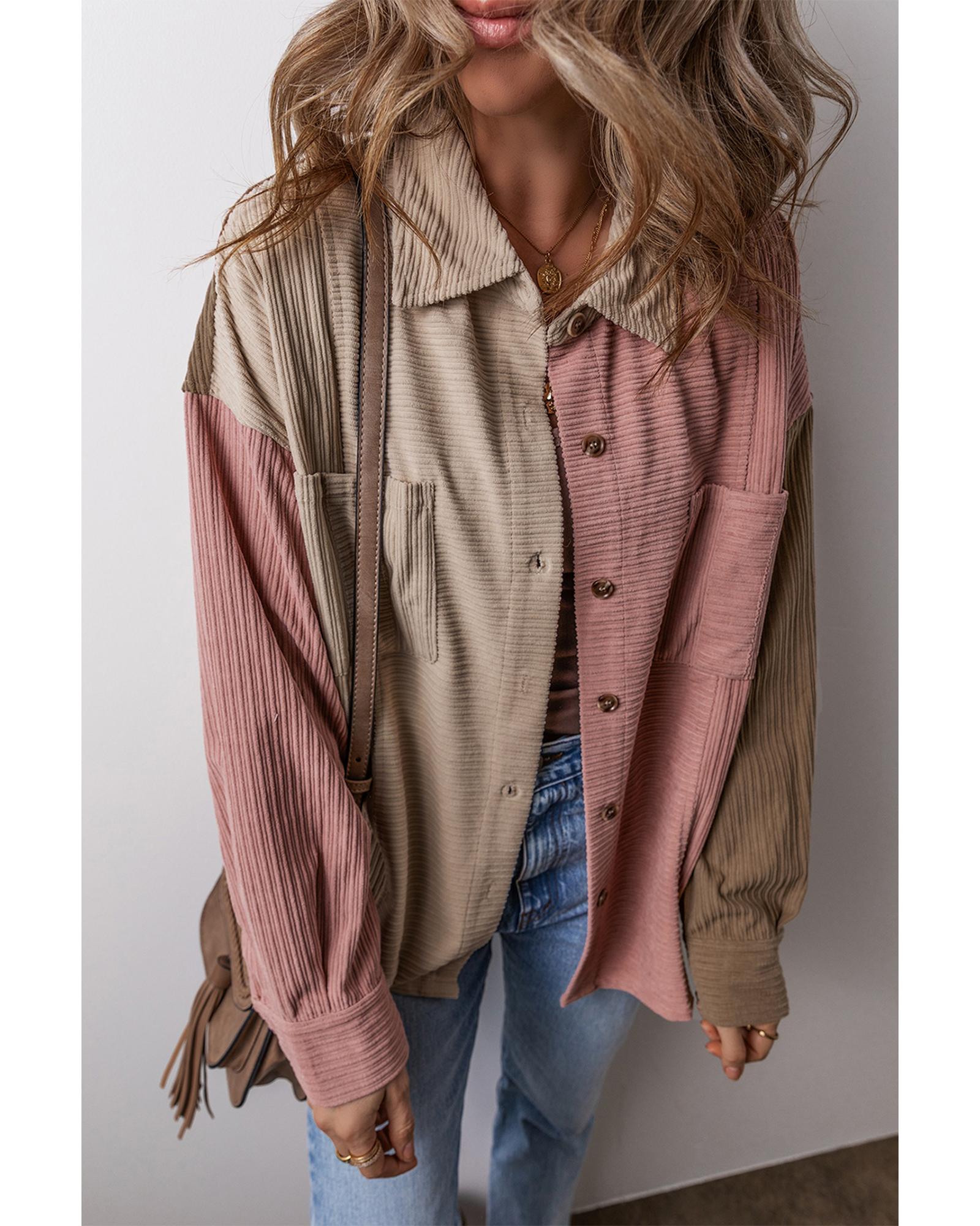 Mineral Red Color Block Chest Pockets Buttoned Corduroy Shacket – L