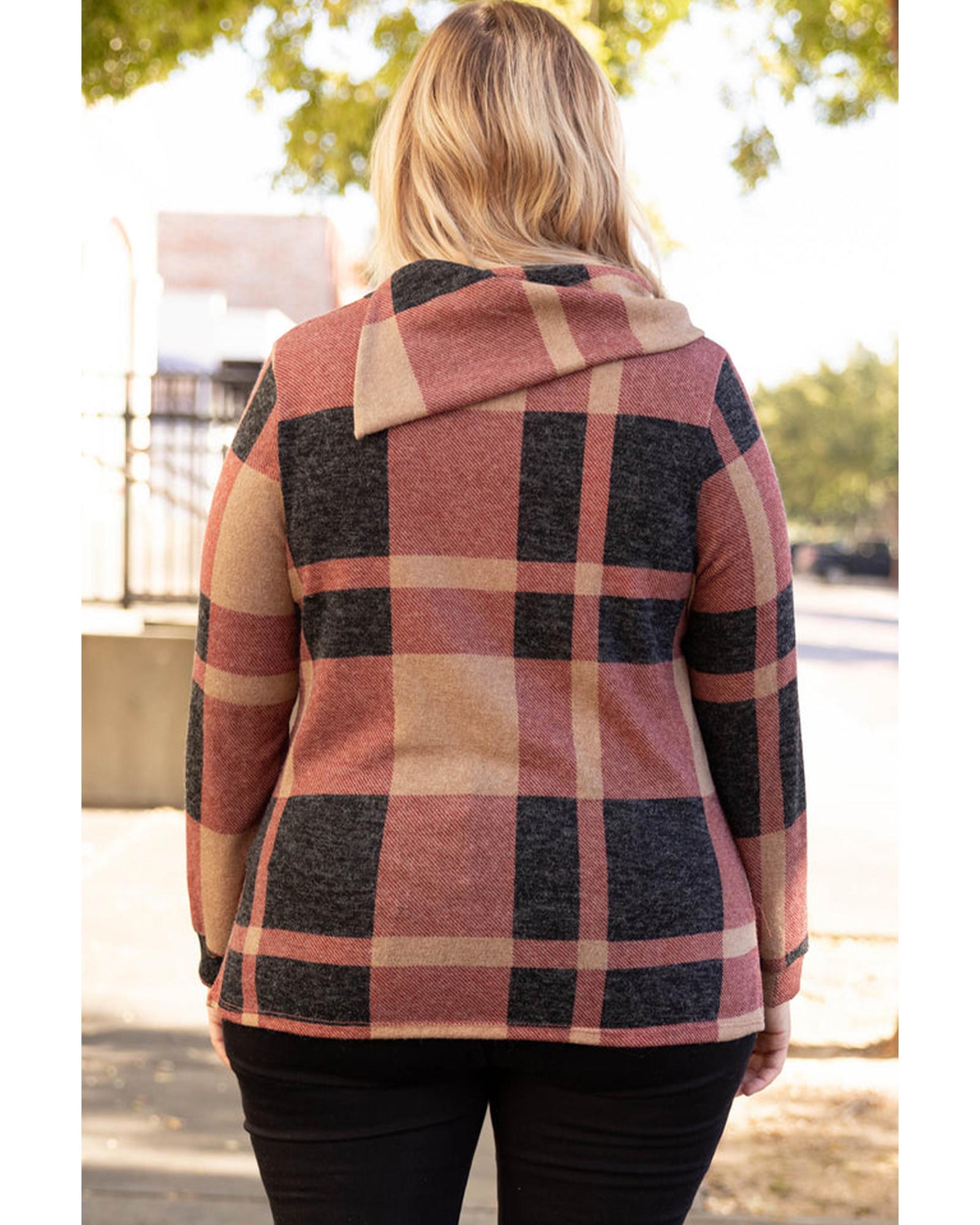 Mineral Red Plus Size Plaid Print Button Decor Asymmetric Neck Top – 1X
