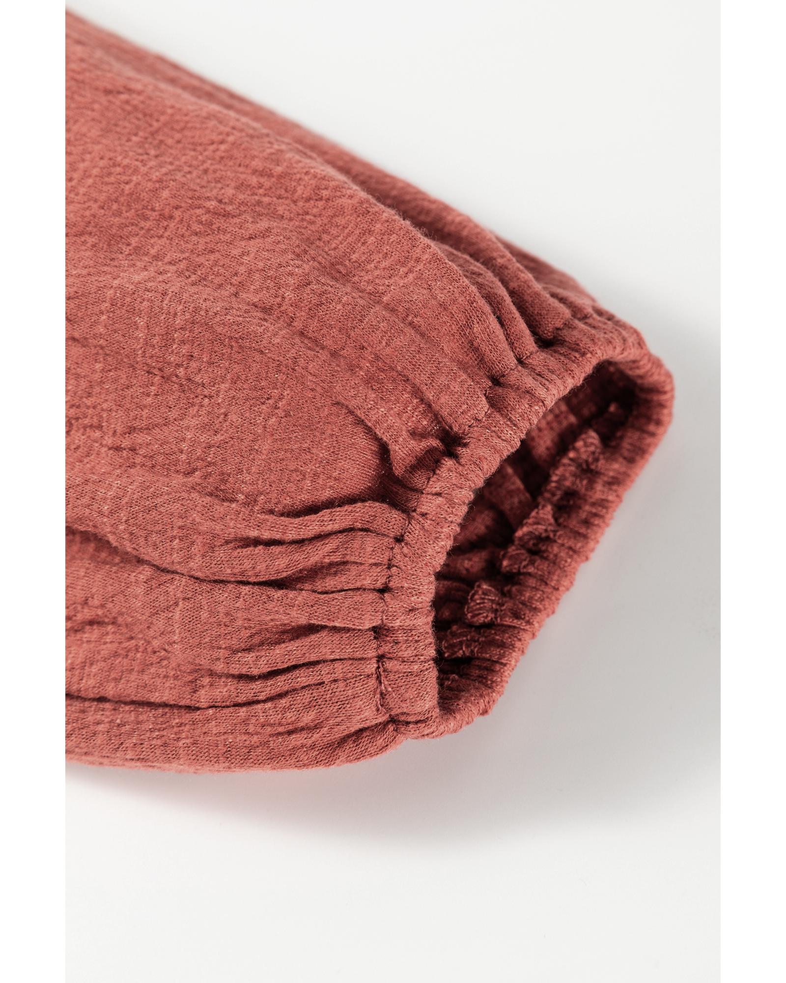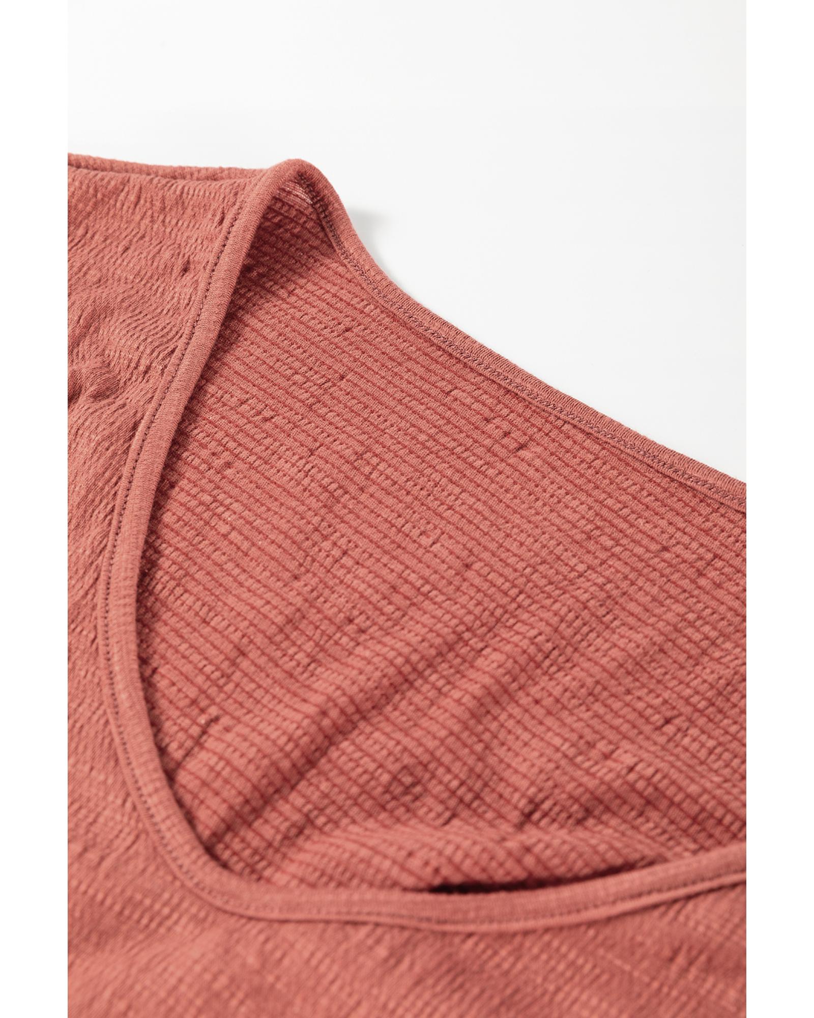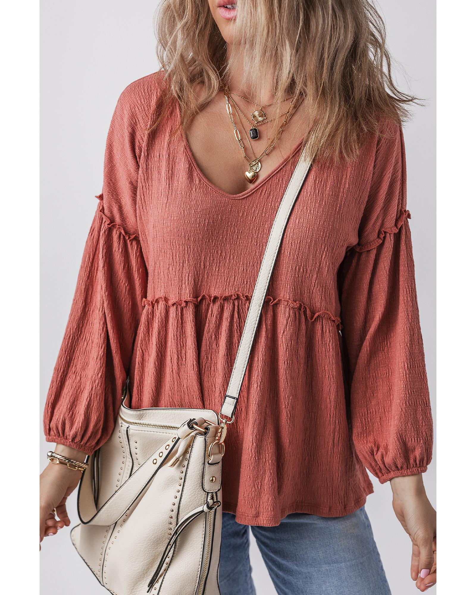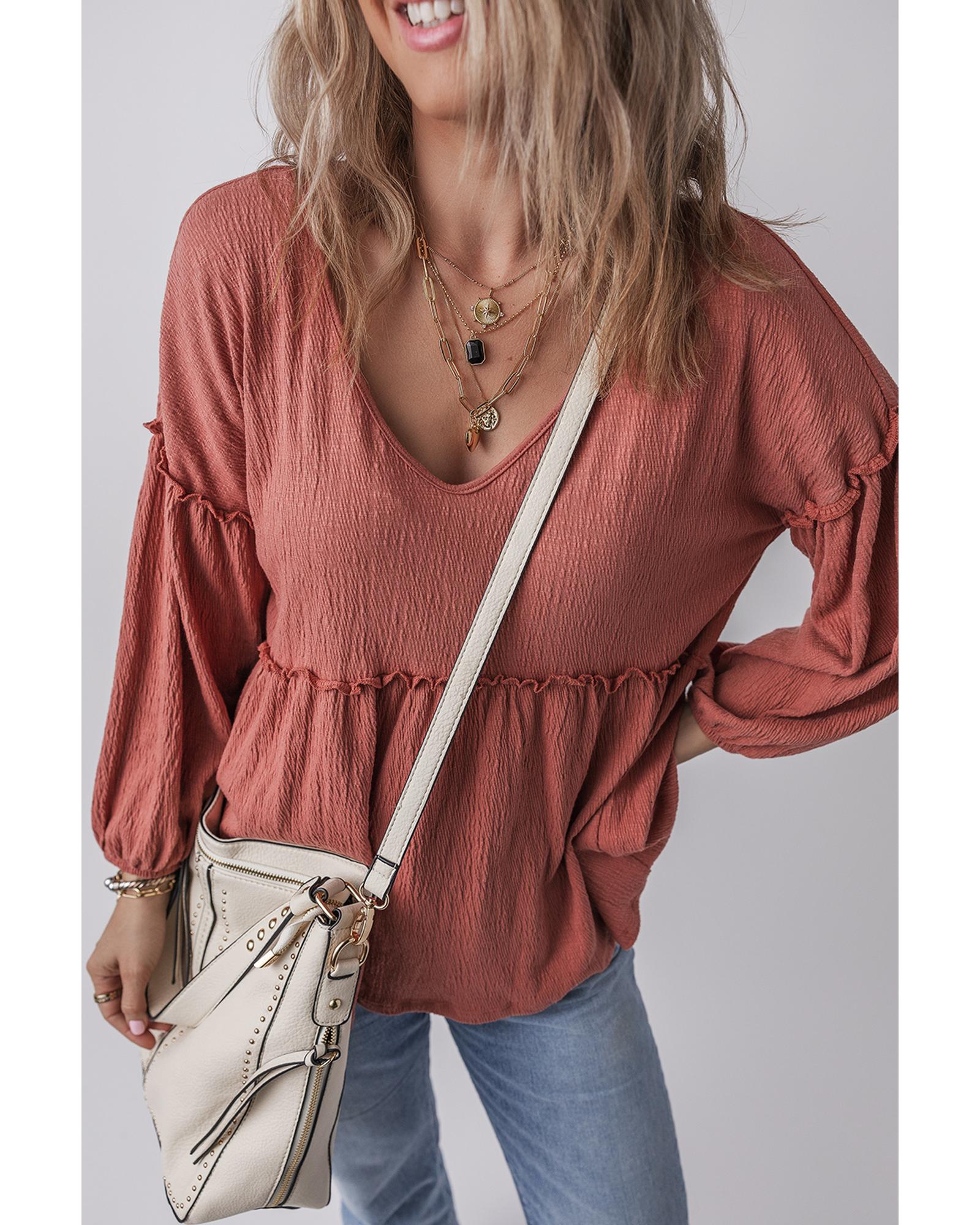 Mineral Red Solid Color Textured Frilled Trim V Neck Puff Sleeve Blouse – M