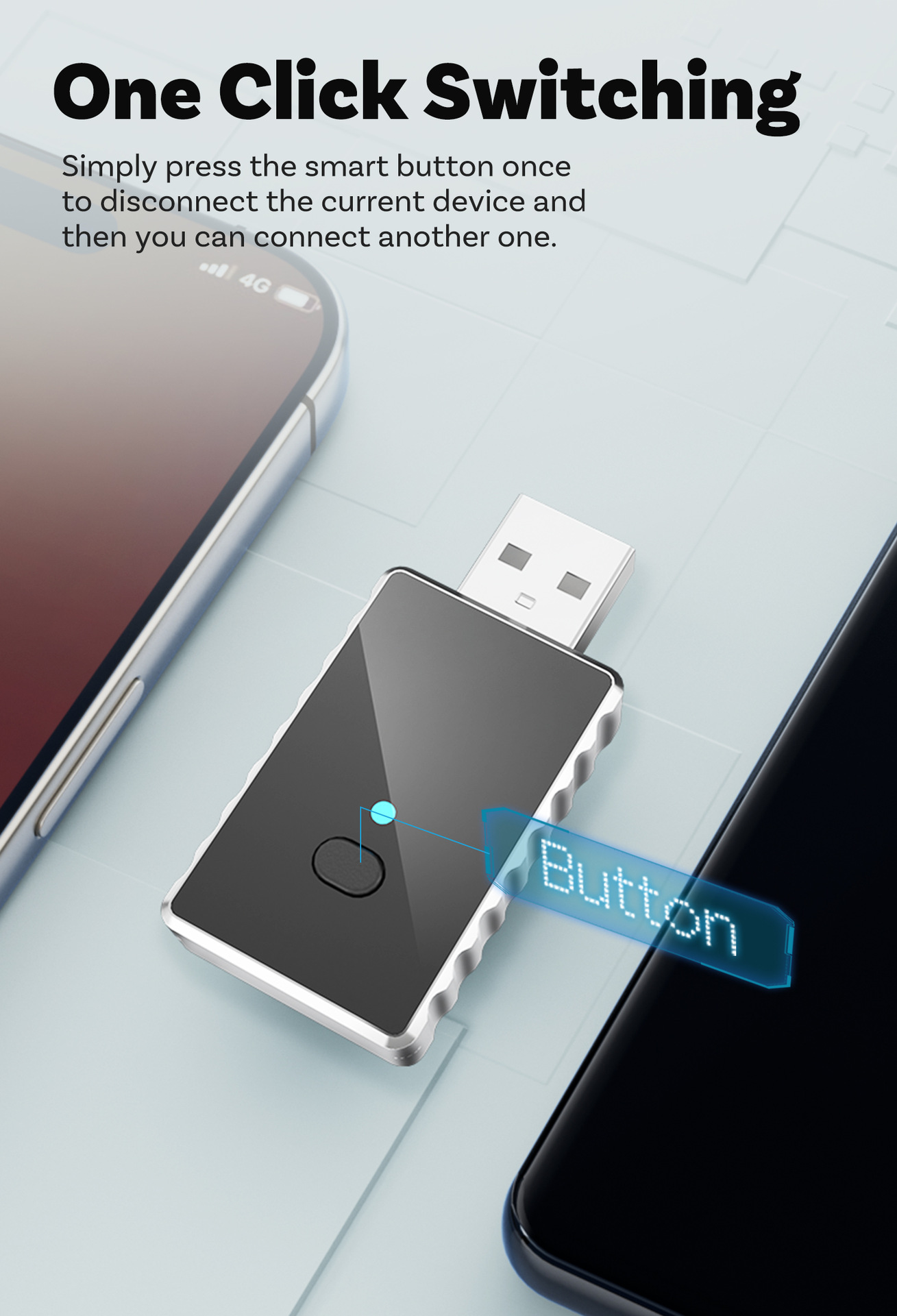 - One-Click Switching: A smart button on the device allows you to easily disconnect the current phone and connect another one with a single press.