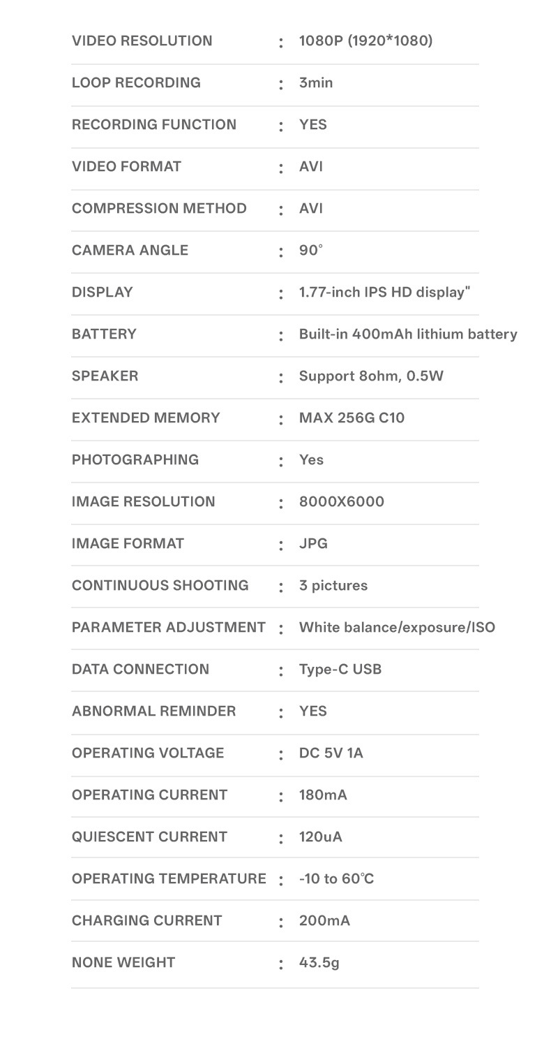 - Long Endurance Battery: The built-in 400mAh lithium battery supports up to 80 minutes of continuous recording on a full charge.