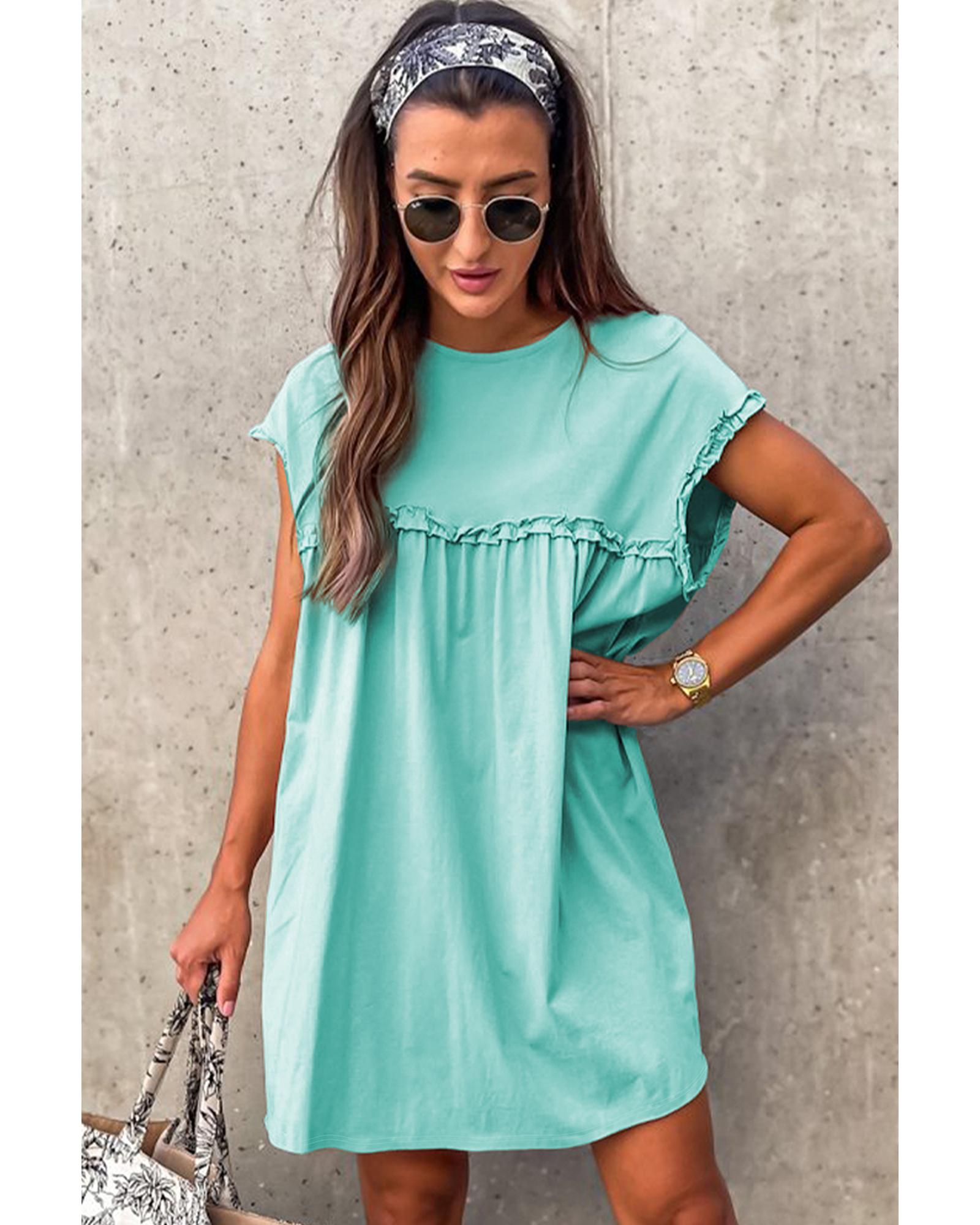 - Mint Green Frilled Trim Crew Neck Loose Fit Mini Dress