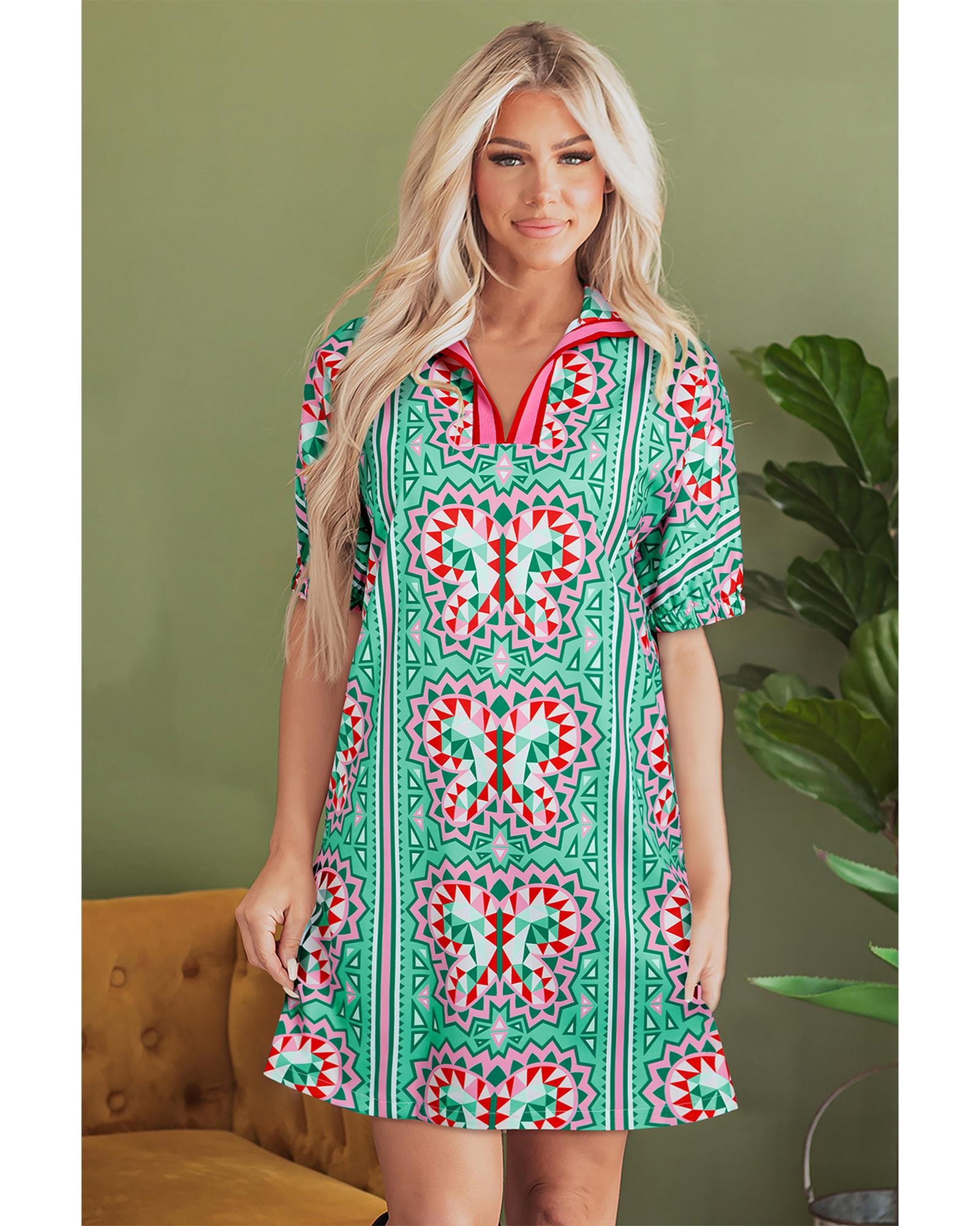 • Mint Green Geometric Butterfly Print Split Neck Short Sleeve Dress