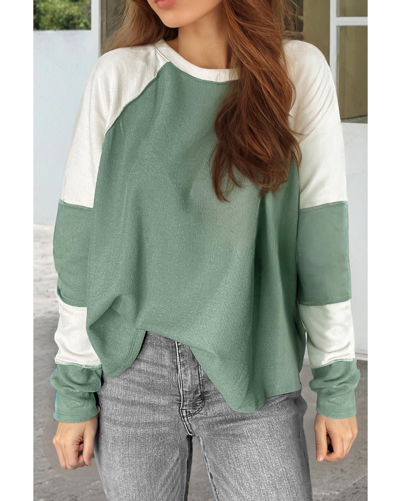 Mint Green Ribbed Colorblock Patchwork Raglan Long Sleeve Top – L