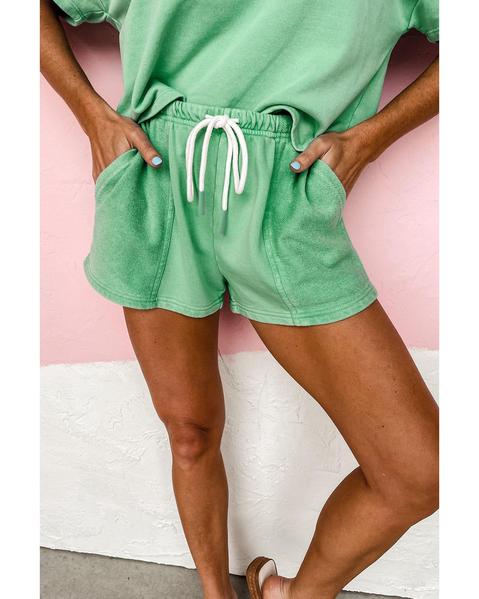 Mint Green V Neck Drop Shoulder Tee and Patchwork Drawstring Shorts Set - S