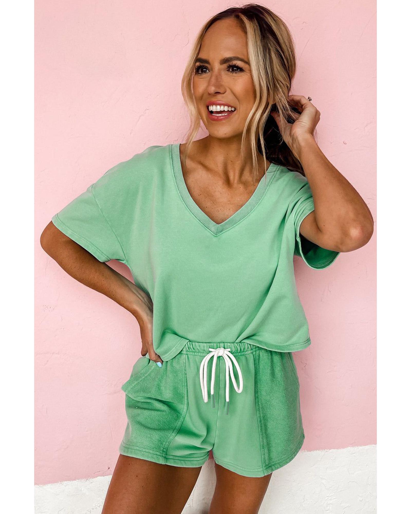 Mint Green V Neck Drop Shoulder Tee and Patchwork Drawstring Shorts Set - M