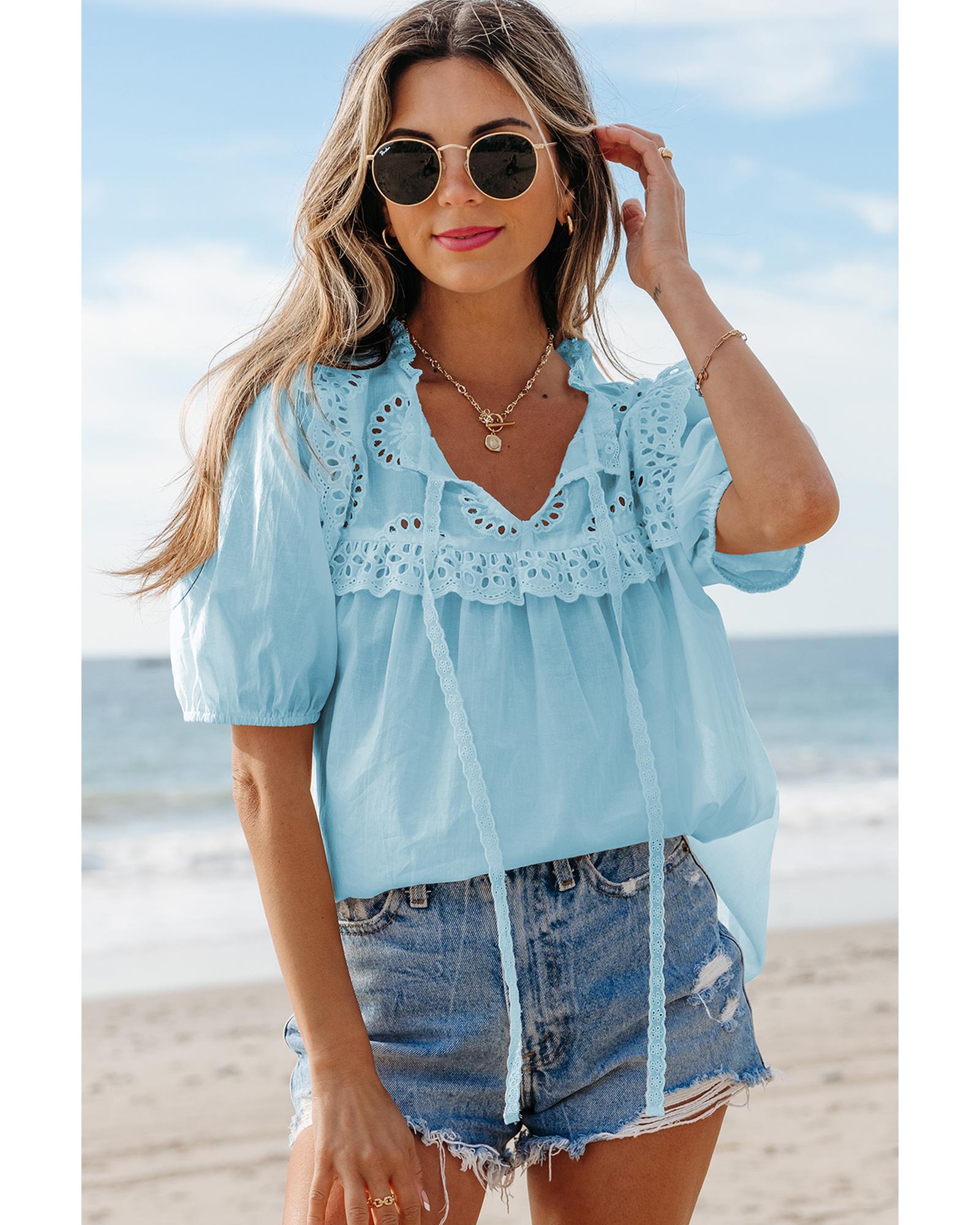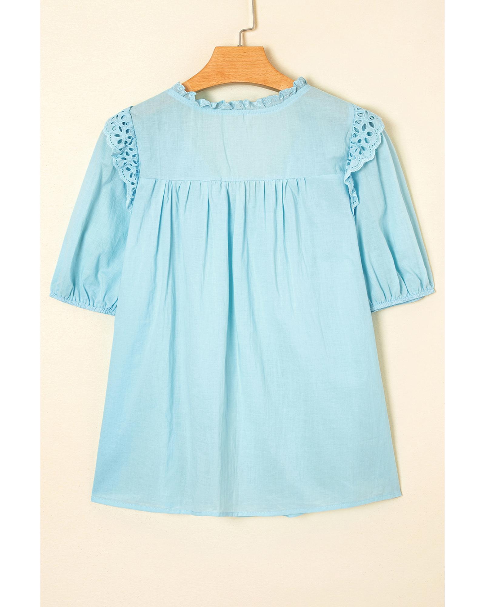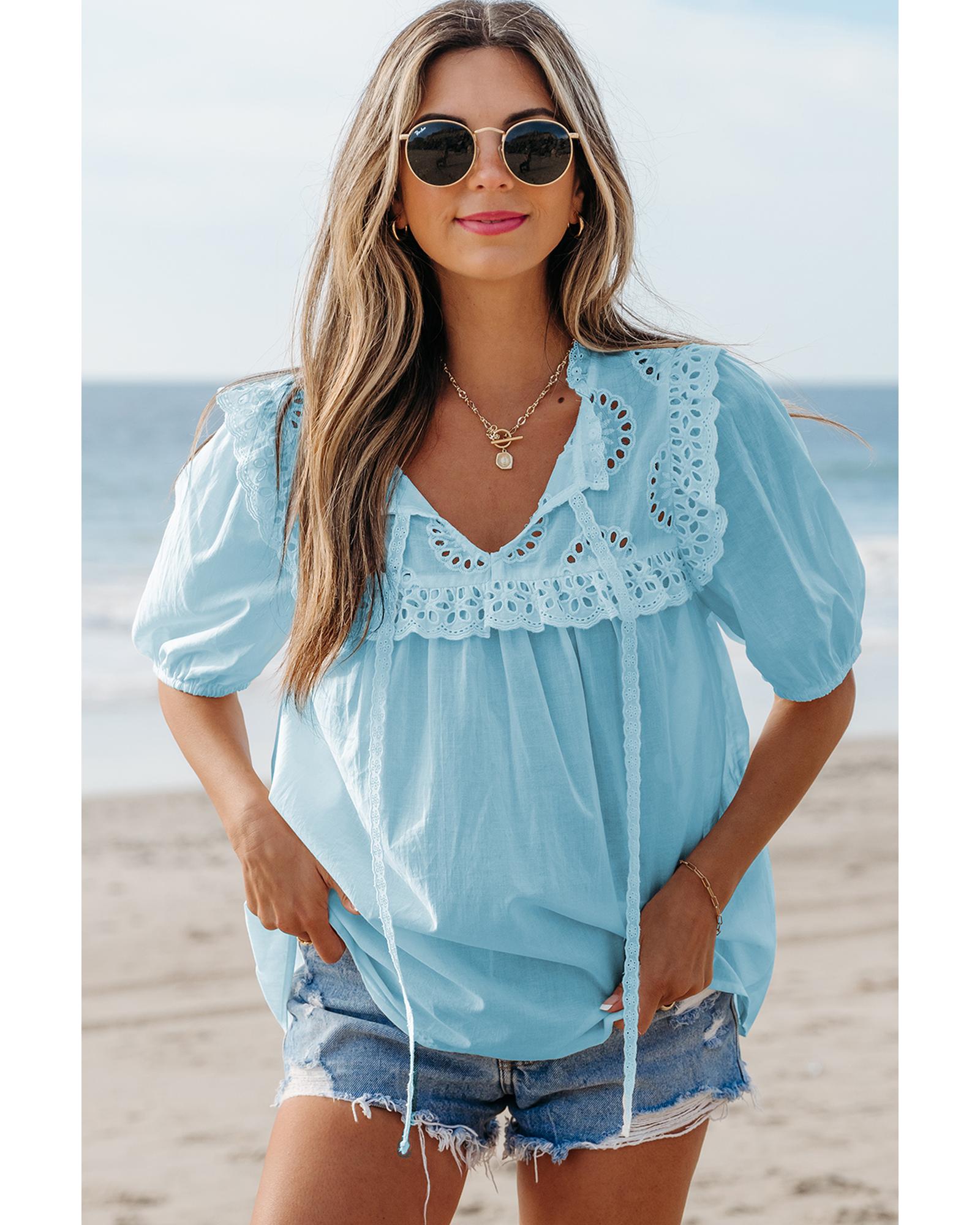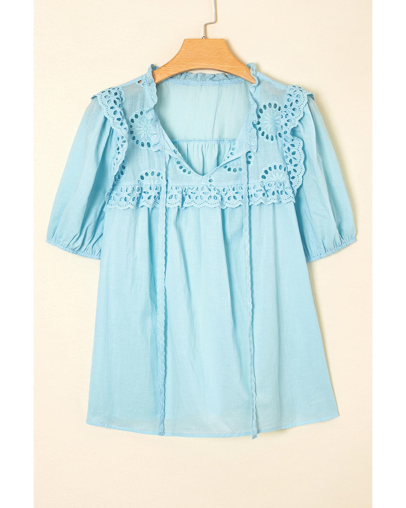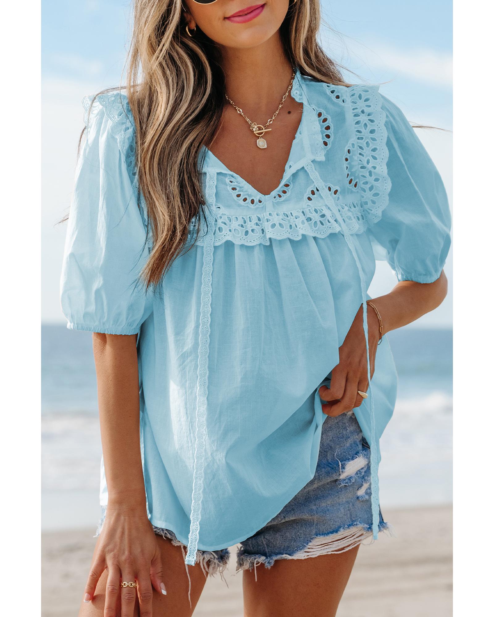 Mist Blue Embroidered Lace Patchwork Tie Neck Puff Short Sleeve Blouse – L