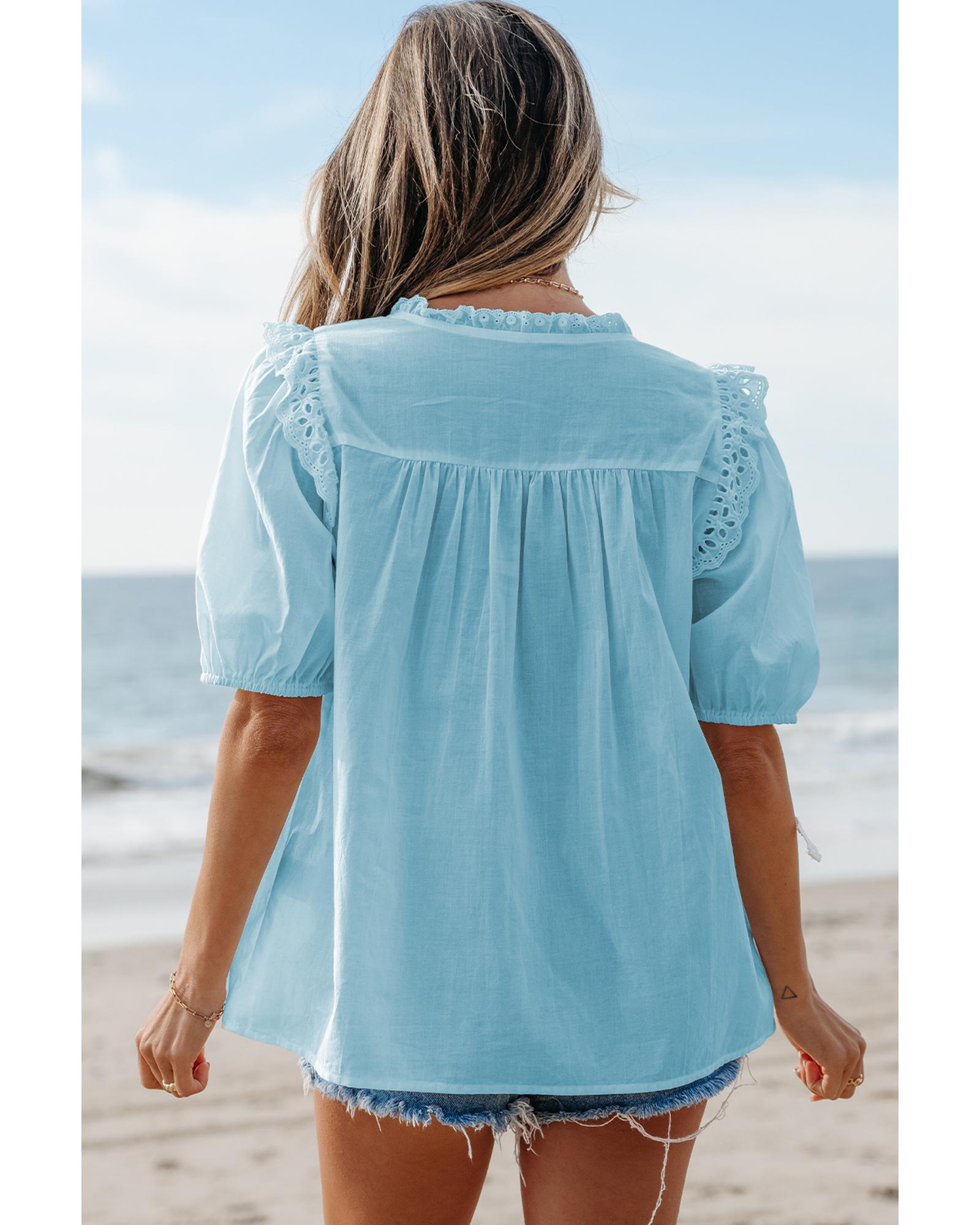 Mist Blue Embroidered Lace Patchwork Tie Neck Puff Short Sleeve Blouse – M