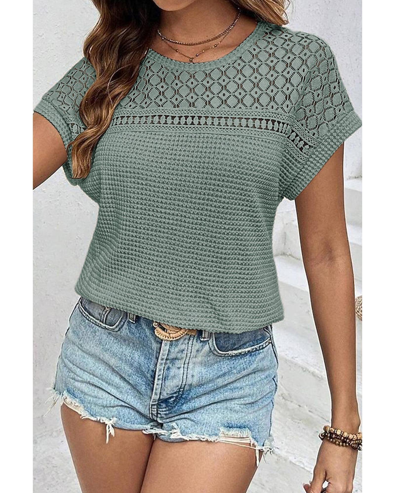 Mist Green Lace Patchwork Waffle Short Sleeve Top – L