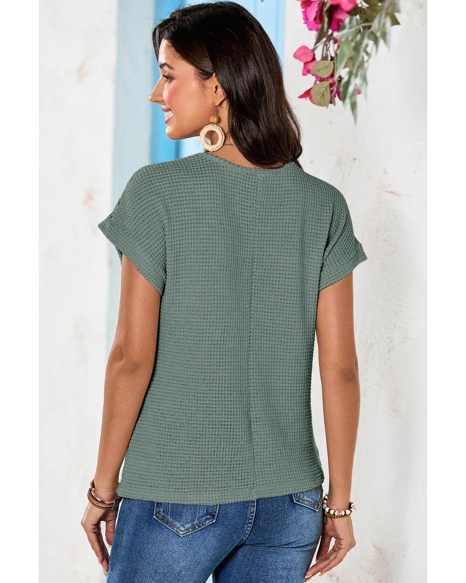 Mist Green Lace Patchwork Waffle Short Sleeve Top – M