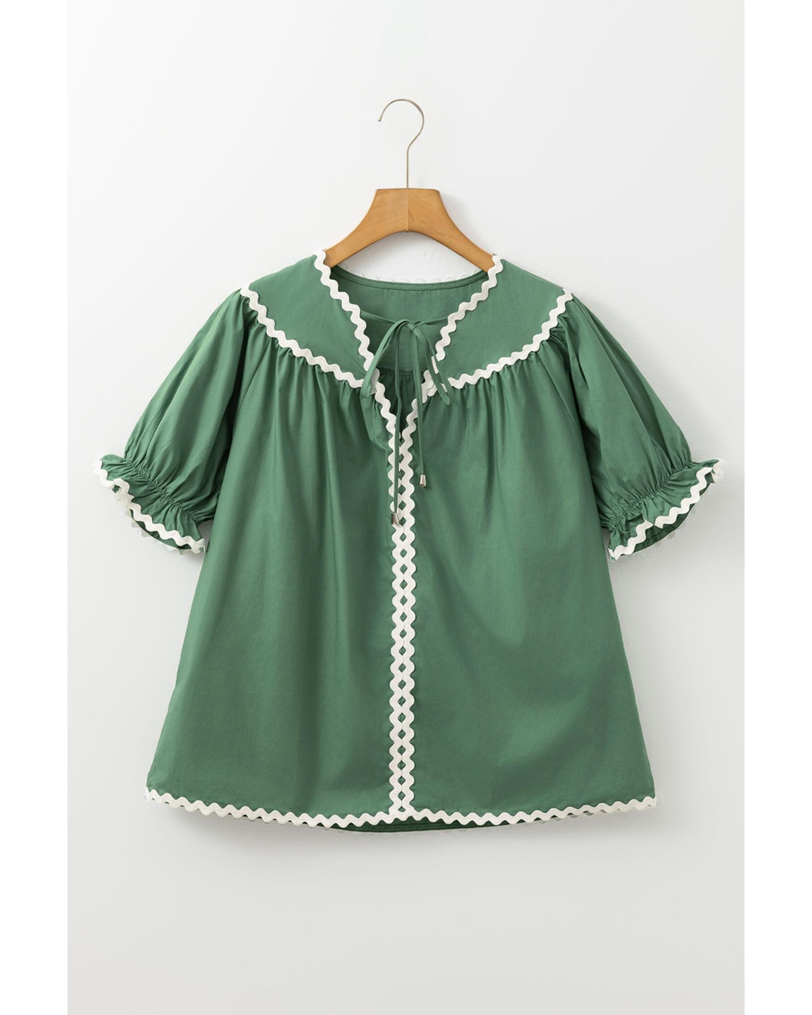 Mist Green Ric Rac Trim Tie Split Neck Short Sleeve Blouse – M