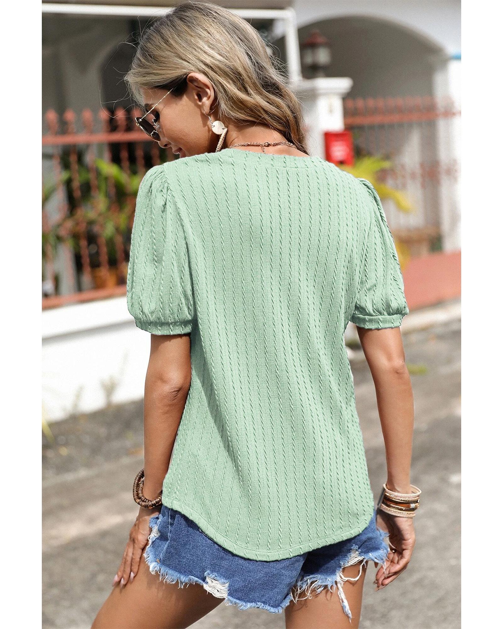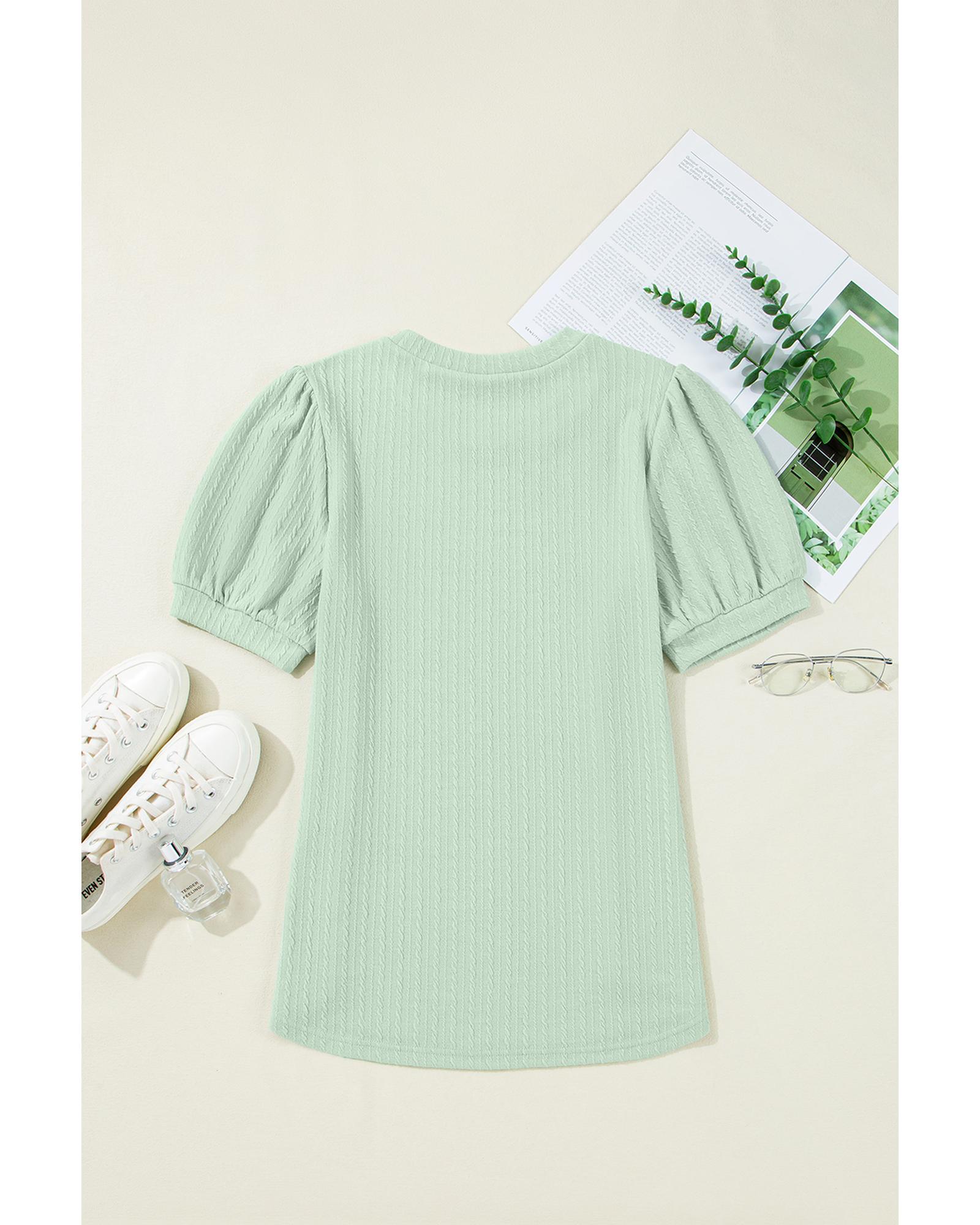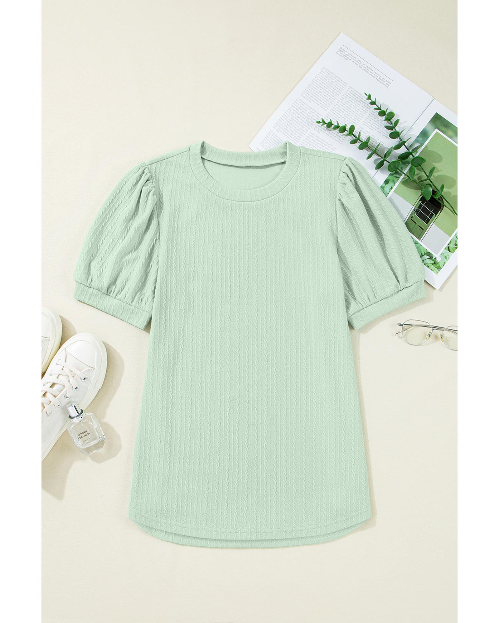 Mist Green Textured Round Neck Short Puff Sleeve Top – M